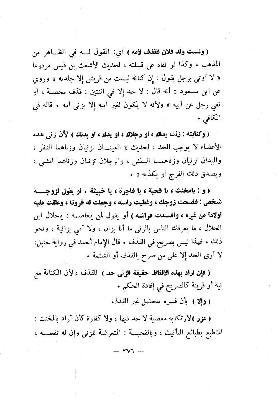 "و: يا مخنث، يا قحبة، يا فاجرة، يا خبيثة، أو يقول لزوجة شخص: فضحت زوجك، وغطيت رأسه وجعلت له قرونا وعلقت عليه أولادا من غيره، وأفسدت فراشه" أو يقول لمن يخاصمه: يا حلال ابن الحلال ما يعرفك الناس بالزنى ما أنا بزان، ولا أمي بزانية ونحو ذلك. فهذا ليس بصريح في القذف. قال الإمام أحمد في رواية حنبل: لا أرى الحد إلا على من صرح بالقذف أو الشتمة.