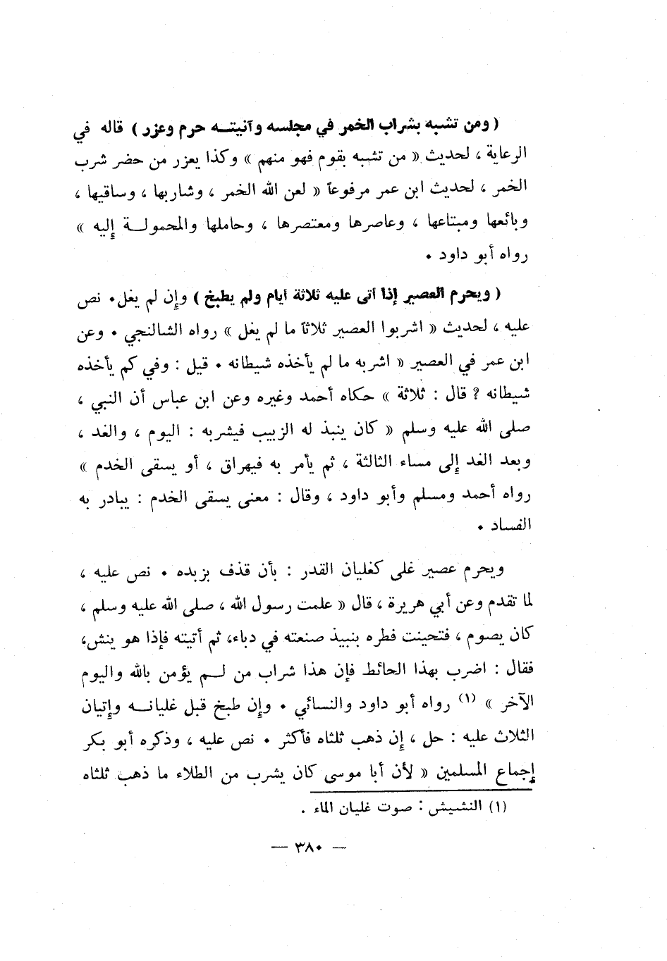 ويحرم عصير غلي كغليان القدر: بأن قذف بزبده. نص عليه، لما تقدم وعن أبي هريرة، قال: علمت رسول الله صلى الله عليه وسلم، كان يصوم، فتحينت فطره بنبيذ صنعته في دباء، ثم أتيته فإذا هو ينش، فقال: "اضرب بهذا الحائط فإن هذا شراب من لم يؤمن بالله واليوم الآخر" 1 رواه أبو داود والنسائي. وإن طبخ قبل غليانه وإتيان الثلاث عليه: حل، إن ذهب ثلثاه فأكثر. نص عليه، وذكره أبو بكر إجماع المسلمين: لأن أبا موسى كان يشرب من الطلاء ما ذهب ثلثاه