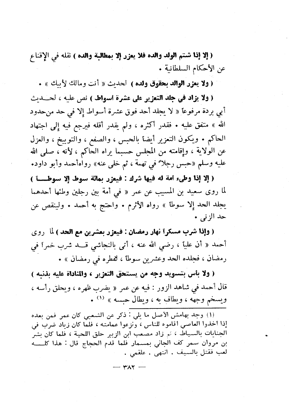 1 وجد بهامش الأصل ما يلي: ذكر عن الشعبي كان عمر فمن بعده إذا أحذوا العاصي أقاموه للناس، ونزعوا عمامته، فلما كان زياد ضرب في الجنايات بالسياط، ثم زاد مصعب ابن الزبير حلق اللحية، فلما كان بشر بن مروان سمر كف الجاني بمسمار فلما قدم الحجاج قال: هذا كله لعب فقتل بالسيف. انتهى. عتلقى.
