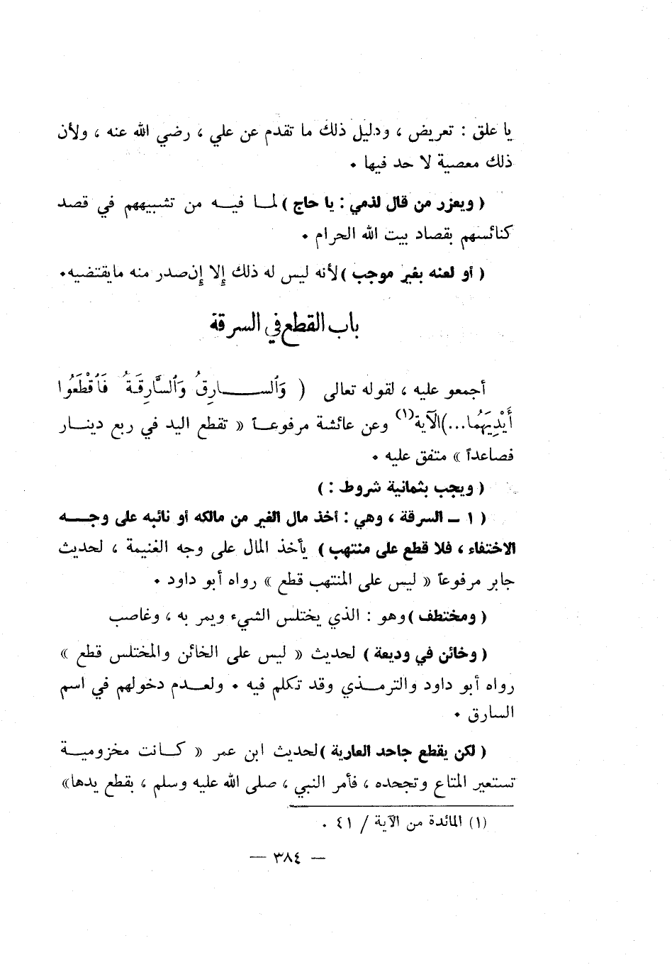 "1- السرقة، وهي: أخذ مال الغير من مالكه أو نائبه على وجه الاختفاء، فلا قطع على منتهب" يأخذ المال على وجه الغنيمة لحديث جابر مرفوعا: "ليس على المنتهب قطع". رواه أبو داود.