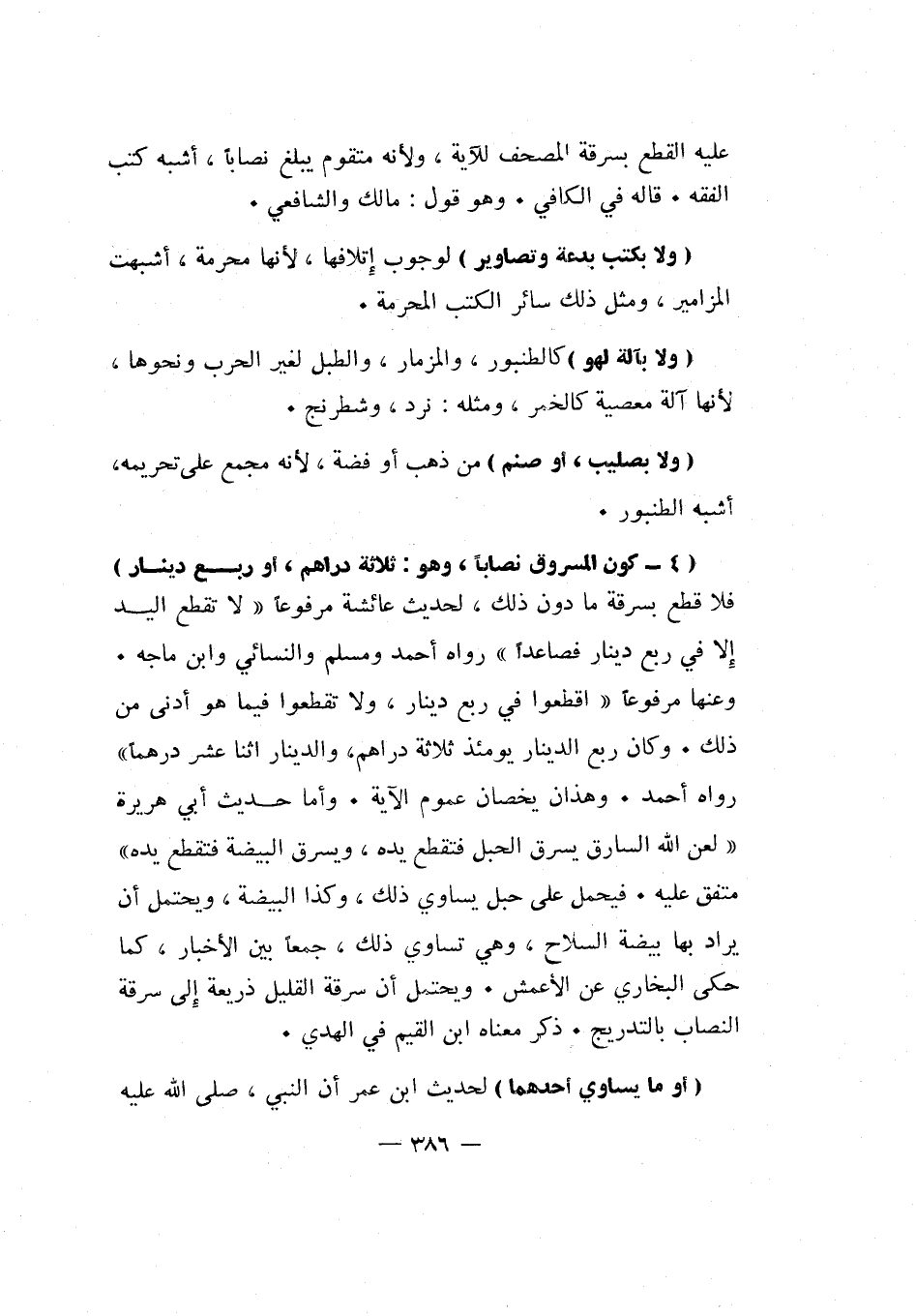 4-"كون المسروق نصابا، وهو: ثلاثة دراهم أو ربع دينار" فلا قطع بسرقة ما دون ذلك، لحديث عائشة مرفوعا: "لا تقطع اليد إلا في ربع دينار فصاعدا" رواه أحمد ومسلم والنسائي وابن ماجه. وعنها مرفوعا: "اقطعوا في ربع دينار، ولا تقطعوا فيما هو أدنى من ذلك". وكان ربع الدينار يومئذ ثلاثة دراهم، والدينار اثنا عشر درهما رواه أحمد. وهذان يخصان عموم الآية. وأما حديث أبي هريرة: "لعن الله السارق يسرق الحبل فتقطع يده، ويسرق البيضة فتقطع يده". متفق عليه. فيحمل على حبل يساوي ذلك، وكذا البيضة، ويحتمل أن يراد بها بيضة السلاح، وهي تساوي ذلك، جمعا بين الأخبار، كما حكى البخاري عن الأعمش. ويحتمل أن سرقة القليل ذريعة إلى سرقة النصاب بالتدريج. ذكر معناه ابن القيم قي الهدي.