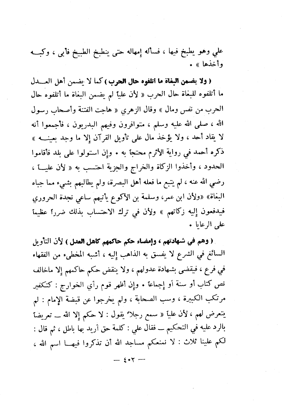 "ولا يضمن البغاة ما أتلفوه حال الحرب" كما لا يضمن أهل العدل ما أتلفوه للبغاة حال الحرب لأن عليا لم يضمن البغاة ما أتلفوه حال الحرب من نفس ومال وقال الزهري: هاجت الفتنة وأصحاب رسول الله صلى الله عليه وسلم، متوافرون وفيهم البدريون، فأجمعوا أنه لا يقاد أحد، ولا يؤخذ مال على تأويل القرآن إلا ما وجد بعينه ذكره أحمد في رواية الأثرم محتجا به. وإن استولوا على بلد فأقاموا الحدود، وأخذوا الزكاة والخراج والجزية احتسب به لأن عليا، رضي الله عنه، لم يتبع ما فعله أهل البصرة، ولم يطالبهم ب شيء مما جباه البغاة ولأن ابن عمر، وسلمة بن الأكوع يأتيهم ساعي نجدة الحروري فيدفعون إليه زكاتهم ولأن في ترك الاحتساب بذلك ضررا عظيما على الرعايا.
