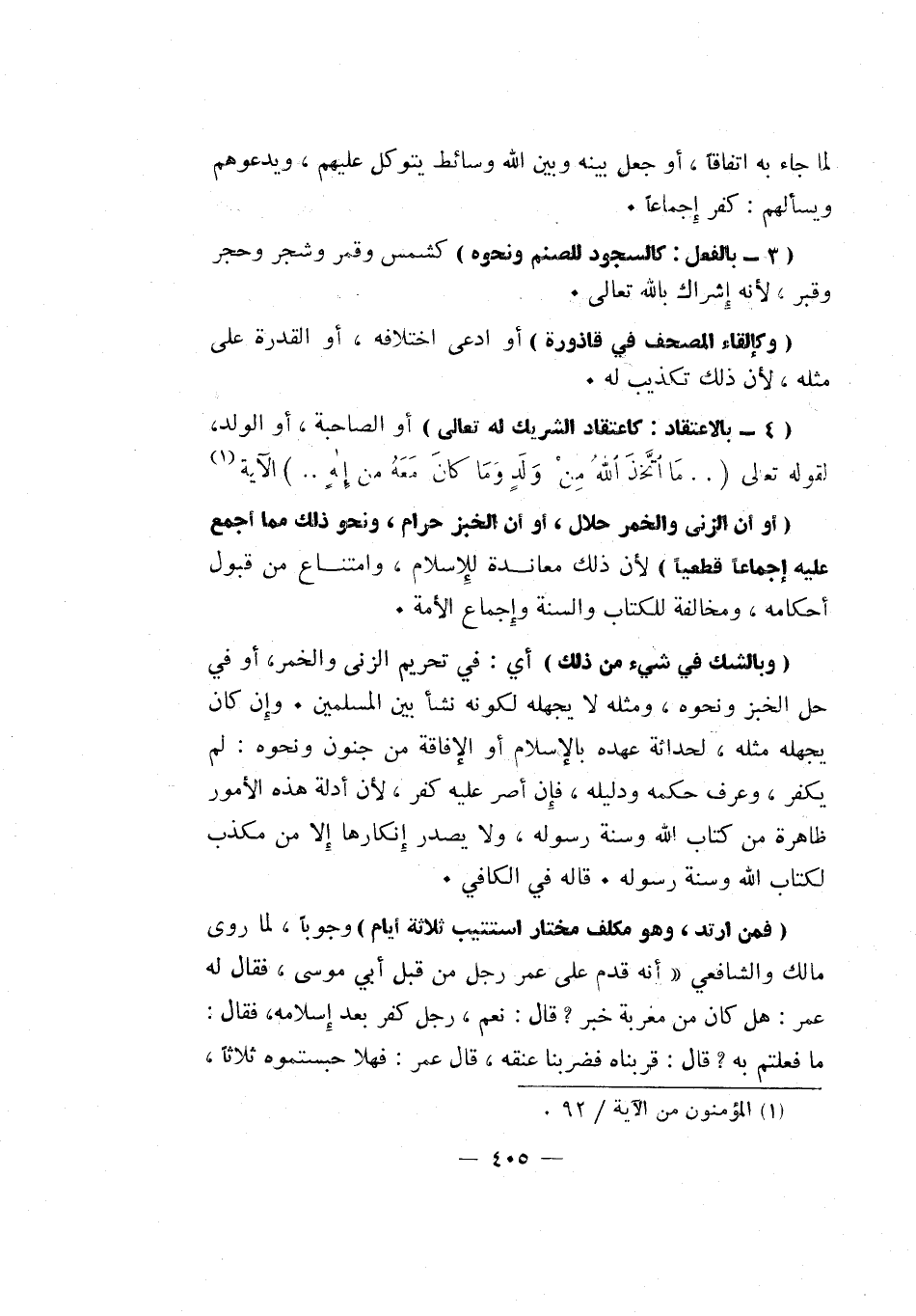 "4- بالاعتقاد: كاعتقاد الشريك له تعالى" أو الصاحبة، أو الولد، لقوله تعالى: {مَا اتَّخَذَ اللَّهُ مِنْ وَلَدٍ وَمَا كَانَ مَعَهُ مِنْ إِلَهٍ} 1.