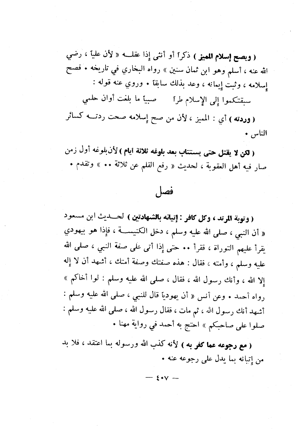 "ويصح إسلام المميز" ذكرا أو أنثى إذا عقله لأن عليا، رضي الله عنه، أسلم وهو ابن ثمان سنين رواه البخاري في تاريخه. فصح إسلامه، وثبت إيمانه، وعد بذلك سابقا. وروي عنه قوله: