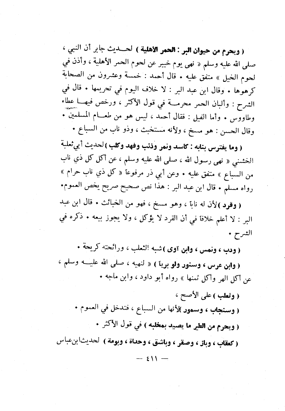 "وما يفترس بنابه: كأسد ونمر وذئب وفهد وكلب" لحديث أبي ثعلبة الخشني نهى رسول الله صلى الله عليه وسلم، عن أكل كل ذي ناب من السباع متفق عليه. وعن أبي ذر مرفوعا: "كل ذي ناب حرام" رواه مسلم. قال ابن عبد البر: هذا نص صحيح صريح يخص العموم.