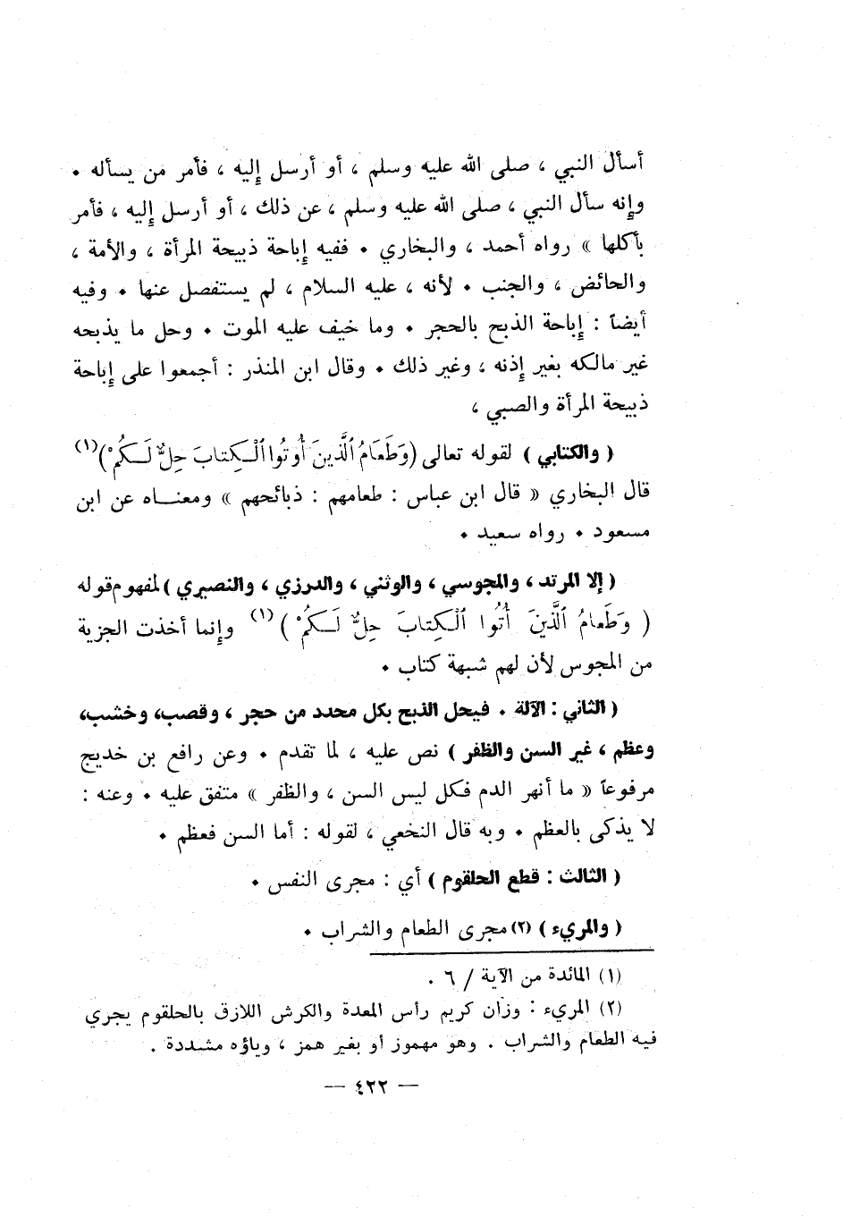 "إلا المرتد، والمجوسي. والوثني، والدرزي، والنصيري" لمفهوم قوله: {وَطَعَامُ الَّذِينَ أُوتُوا الْكِتَابَ حِلٌّ لَكُمْ} 1 وإنما أخذت الجزية من المجوس لأن لهم شبهة كتاب.