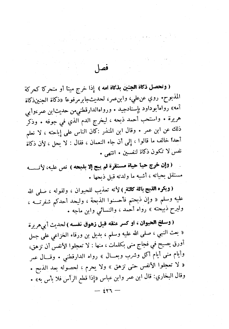 "وسلخ الحيوان، أو كسر عنقه قبل زهوق نفسه" لحديث أبي هريرة: بعث النبي صلى الله عليه وسلم، بديل بن ورقاء الخزاعي على جمل أورق يصيح في فجاج منى بكلمات، منها: "لا تعجلوا الأنفس أن تزهق، وأيام منى أيام أكل وشرب وبعال" رواه الدارقطني. وقال عمر لا تعجلوا الأنفس حتى تزهق ولا يحرم، لحصوله بعد الذبح.