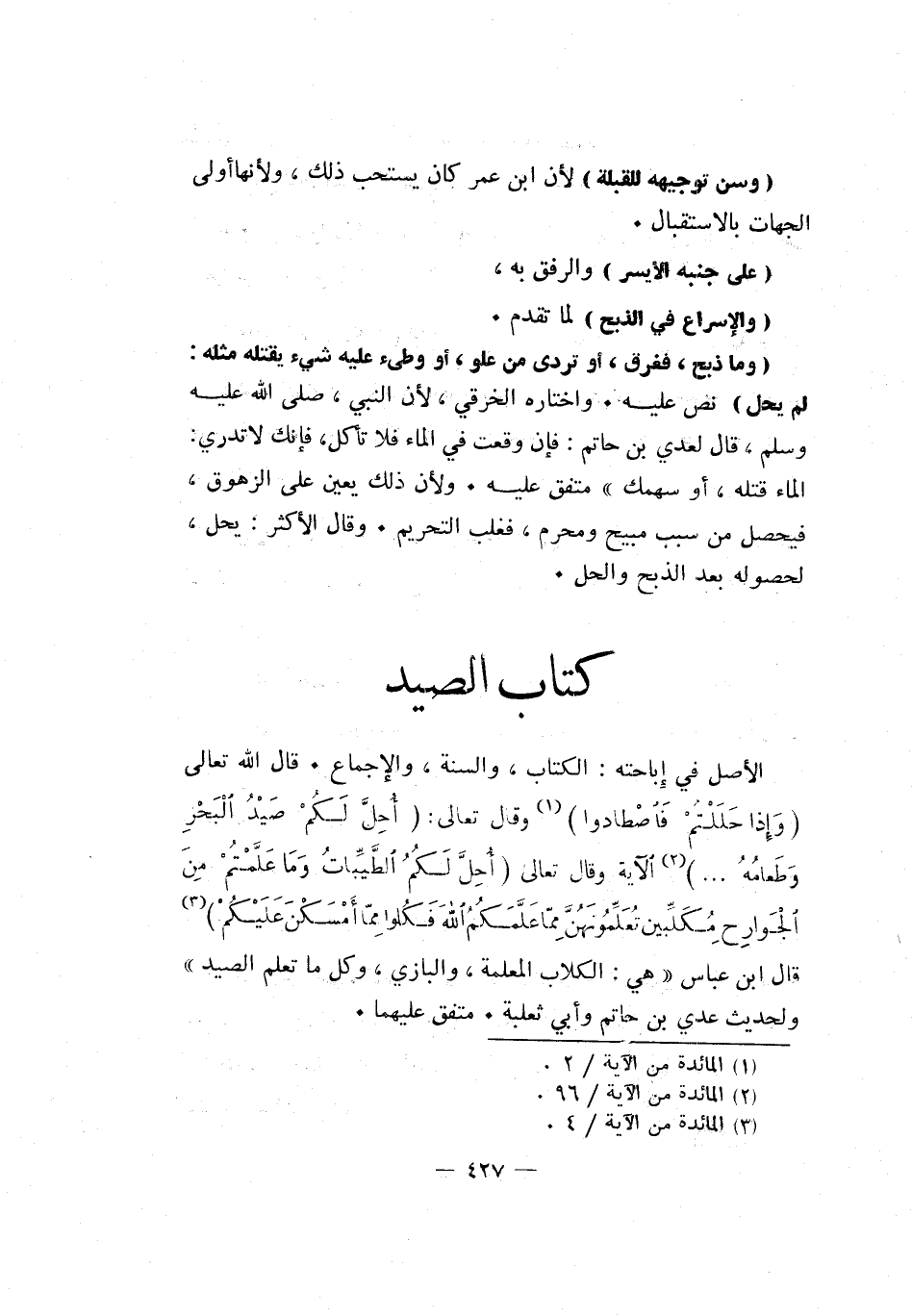 الأصل في إباحته: الكتاب، والسنة، والإجماع. قال الله تعالى: {وَإِذَا حَلَلْتُمْ فَاصْطَادُوا} 1 وقال تعالى: {أُحِلَّ لَكُمْ صَيْدُ الْبَحْرِ وَطَعَامُهُ} 2 الآية وقال تعالى: {أُحِلَّ لَكُمُ الطَّيِّبَاتُ وَمَا عَلَّمْتُمْ مِنَ الْجَوَارِحِ مُكَلِّبِينَ تُعَلِّمُونَهُنَّ مِمَّا عَلَّمَكُمُ اللَّهُ فَكُلُوا مِمَّا أَمْسَكْنَ عَلَيْكُمْ} 3 قال ابن عباس وهي: الكلاب المعلمة، والبازي، وكل ما تعلم الصيد ولحديث عدي بن حاتم وأبي ثعلبة. متفق عليهما.