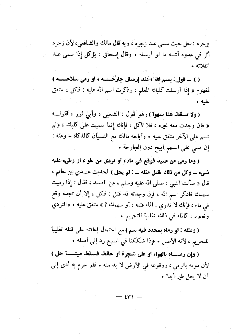"4- قول: بسم الله، عند إرسال جارحه، أو رمي سلاحه" لمفهوم "إذا أرسلت كلبك المعلم، وذكرت اسم الله عليه: فكل" متفق عليه.