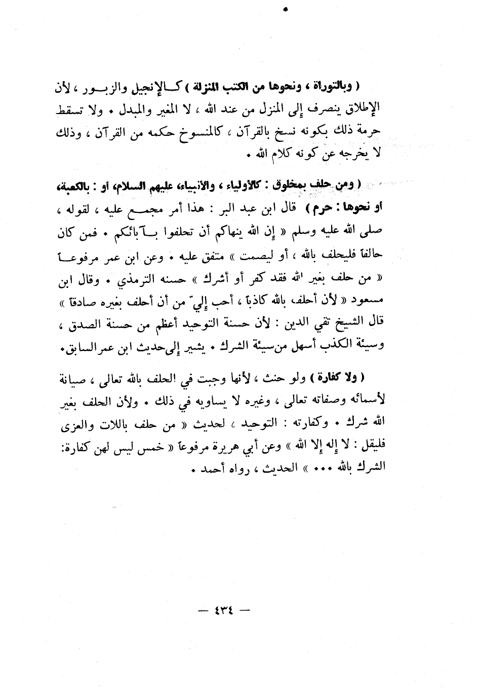 "ومن حلف بمخلوق: كالأولياء، والأنبياء عليهم السلام. أو: بالكعبة أو نحوها: حرم" قال ابن عبد البر: هذا أمر مجمع عليه، لقوله صلى الله عليه وسلم: "إن الله ينهاكم أن تحلفوا بآبائكم. فمن كان حالفا فليحلف بالله، أو ليصمت" متفق عليه. وعن ابن عمر مرفوعا: "من حلف بغير الله فقد كفر أو أشرك" حسنه الترمذي. وقال ابن مسعود: أن أحلف بالله كاذبا، أحب إلي من أن أحلف بغيره صادقا قال الشيخ تقي الدين: لأن حسنة التوحيد أعظم من حسنة الصدق، وسيئة الكذب أسهل من سيئة الشرك. يشير إلى حديث ابن عمر السابق.