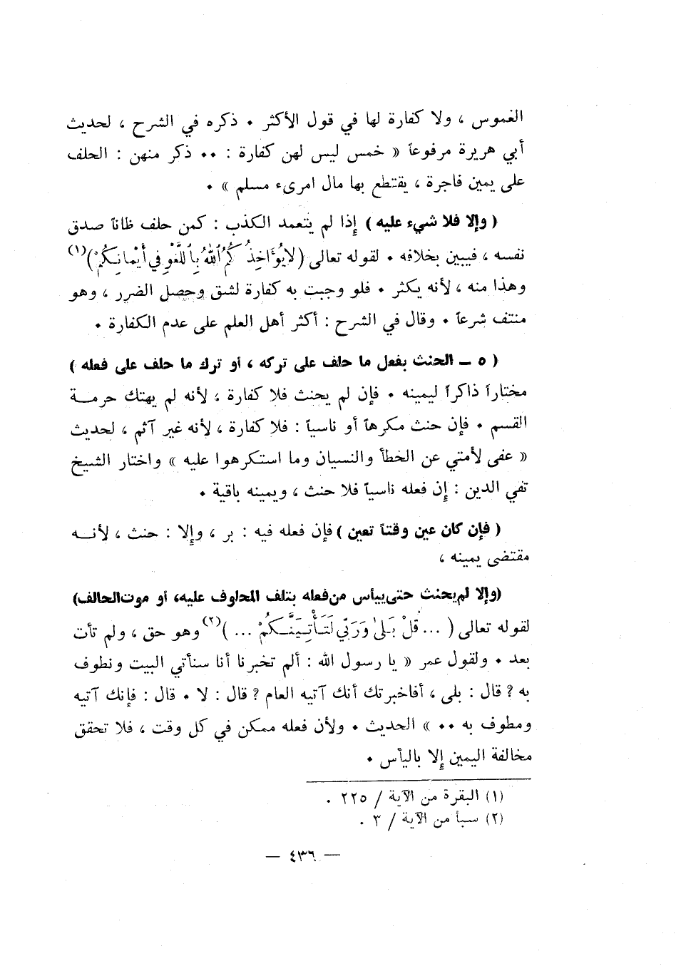 "5- الحنث بفعل ما حلف على تركه أو ترك ما حلف على فعله" مختارا ذاكرا ليمينه. فإن لم يحنث فلا كفارة، لأنه لم يهتك حرمة القسم. فإن حنث مكرها أو ناسيا: فلا كفارة، لأنه غير آثم، لحديث "عفي لأمتي عن الخطأ والنسيان وما استكرهوا عليه" واختار الشيخ تقي الدين: إن فعله ناسيا فلا حنث، ويمينه باقية.