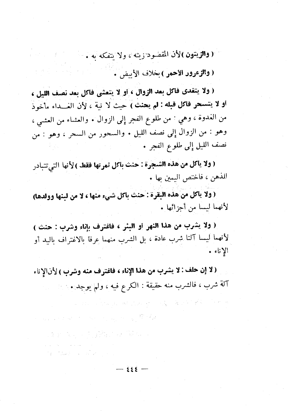 "ولا يتغذى فأكل بعد الزوال، أو لا يتعشى فأكل بعد نصف اليل، أو لا يتسحر فأكل قبله: لم يحنث" حيث لا نية، لأن الغداء مأخوذ من الغدوة، وهي من طلوع الفجرإلى الزوال. والعشاء من العشي، وهو: من الزوال إلى نصف الليل. والسحور من السحر، وهو: من نصف الليل إلى طلوع الفجر.