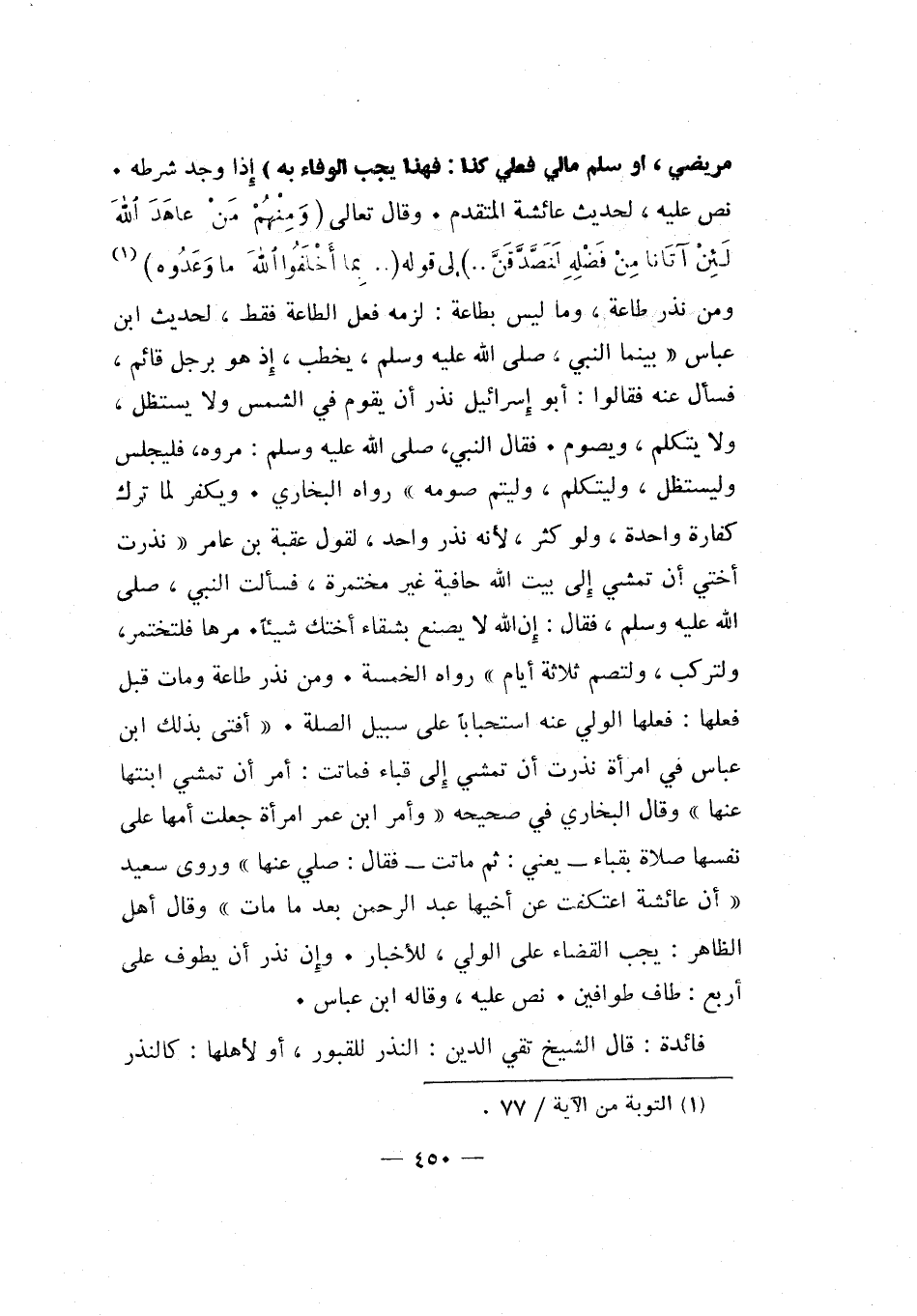 مريضي، أو سلم مالي فعلي كذا: فهذا يجب الوفاء به" إذا وجد شرطه. نص عليه، لحديث عائشة المتقدم. وقال تعالى: {وَمِنْهُمْ مَنْ عَاهَدَ اللَّهَ لَئِنْ آتَانَا مِنْ فَضْلِهِ لَنَصَّدَّقَنَّ} إلى قوله { ... بِمَا أَخْلَفُوا اللَّهَ مَا وَعَدُوهُ} 1 ومن نذر طاعة، وما ليس بطاعة: لزمه فعل الطاعة فقط، لحديث ابن عباس بينما النبي صلى الله عليه وسلم، يخطب، إذ هو برجل قائم، فسأل عنه فقالوا: أبو إسرائيل نذر أن يقوم في الشمس ولا يستظل، ولا يتكلم، ويصوم. فقال النبي صلى الله عليه وسلم: "مروه، فليجلس وليستظل، وليتكلم، وليتم صومه" رواه البخاري. ويكفر لما ترك كفارة واحدة، ولو كثر، لأنه نذر واحد، لقول عقبة بن عامر: نذرت أختي أن تمشي إلى بيت الله حافية غير مختمرة، فسألت النبي صلى الله عليه وسلم، فقال: "إن الله لا يصنع بشقاء أختك شيئا. مرها فلتختمر، ولتركب، ولتصم ثلاثة أيام" رواه الخمسة، ومن نذر طاعة ومات قبل فعلها: فعلها الولي عنه استحبابا على سبيل الصلة. أفتى بذلك ابن عباس في امرأة نذرت أن تمشي إلى قباء فماتت: أمر أن تمشي ابنتها عنها وقال البخاري في صحيحه وأمر ابن عمر امرأة جعلت أمها على نفسها صلاة بقباء - يعني: ثم ماتت - فقال: صلي عنها وروى سعيد أن عائشة اعتكفت عن أخيها عبد الرحمن بعد ما مات وقال أهل الظاهر: يجب القضاء على الولي، للأخبار. وإن نذر أن يطوف على أربع: طاف طوافين. نص عليه، وقاله ابن عباس.