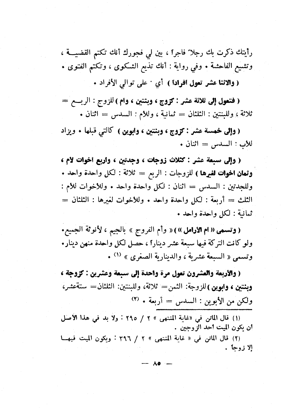 "وتسمى أم الأرامل" وأم الفروج بالجيم، لأنوثة الجميع. ولو كانت التركة فيها سبعة عشر ديناراً، حصل لكل واحدة منهن دينار. وتسمى السبعة عشرية، والدينارية الصغرى1.