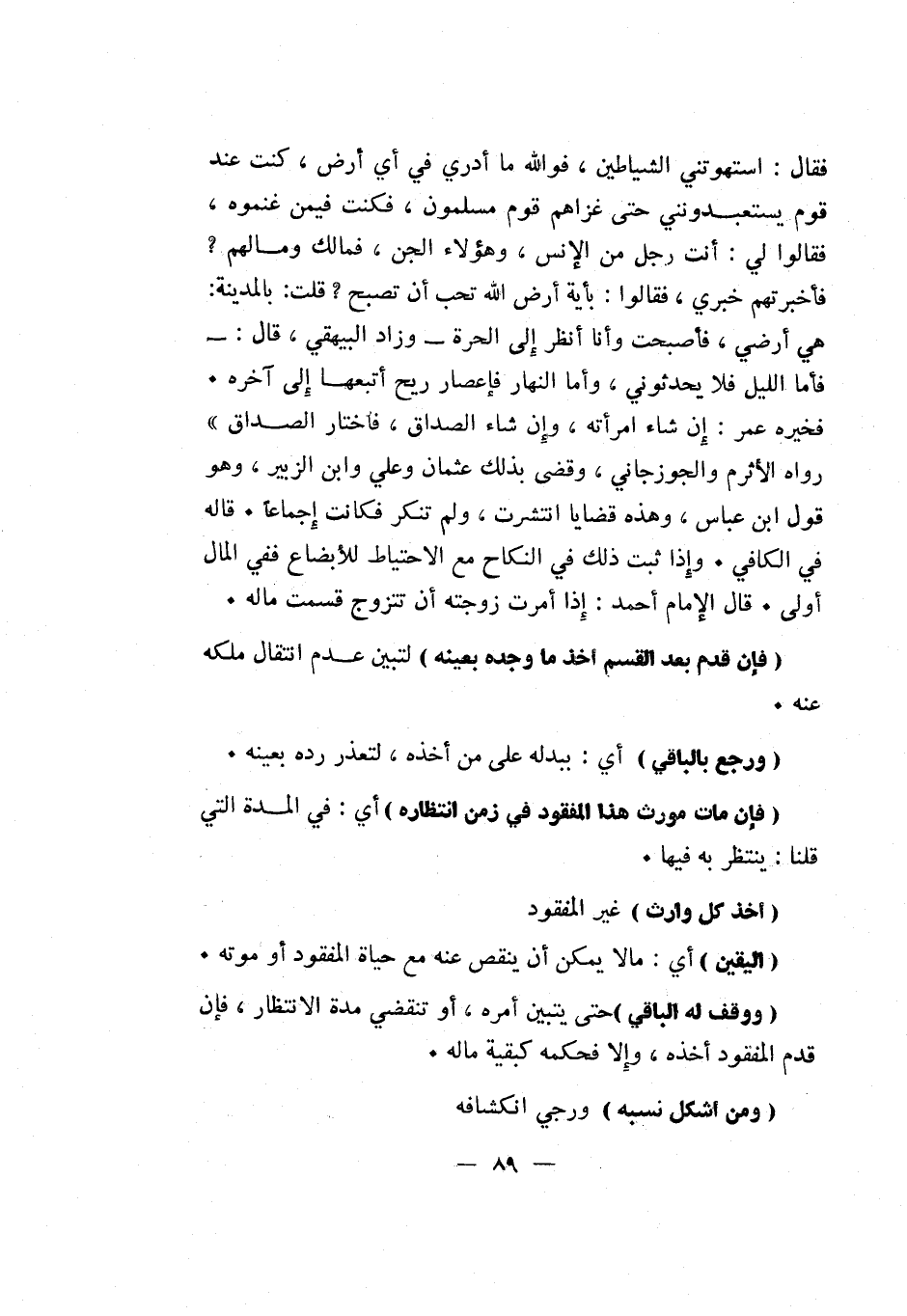 فقال: استهوتني الشياطين، فوالله ما أدري في أي أرض، كنت عند قوم يستعبدونني حتى غزاهم قوم مسلمون، فكنت فيمن غنموه، فقالوا لي: أنت رجل من الإنس، وهؤلاء الجن، فما لك وما لهم؟ فأخبرتهم خبري، فقالوا: بأية أرض الله تحب أن تصبح؟ فقلت: بالمدينة: هي أرضي، فأصبحت وأنا أنظر إلى الحرة - وزاد البيهقي، قال: - فأما الليل فلا يحدثوني، وأما النهار فإعصار ريح أتبعها إلى آخره.