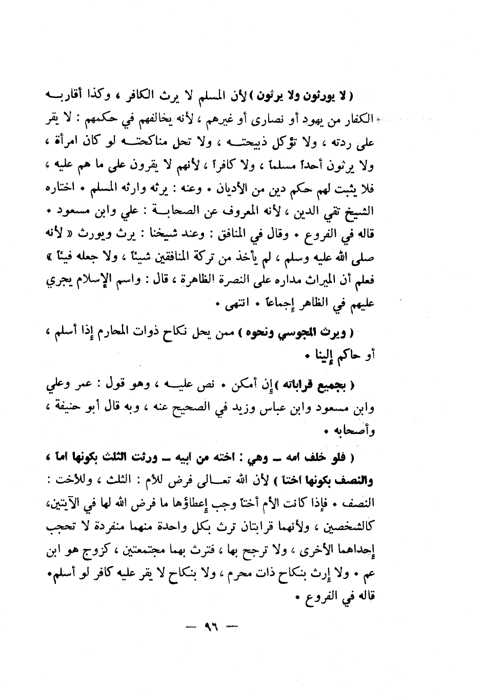 "لا يورثون ولا يرثون" لأن المسلم لا يرث الكافر، وكذا أقاربه الكفار من يهود أو نصارى أو غيرهم، لأنه يخالفهم في حكمهم: لا يقر على ردته، ولا تؤكل ذبيحته، ولا تحل مناكحته لو كان امرأة. ولا يرثون أحداً مسلماً، ولا كافراً، لأنهم لا يقرون على ما هم عليه، فلا يثبت لهم حكم دين من الأديان. وعنه: يرثه وارثه المسلم. اختاره الشيخ تقي الدين، لأنه المعروف عن الصحابة: علي وابن مسعود. قاله في الفروع. وقال في المنافق: وعند شيخنا: يرث ويورث لأنه صلى الله عليه وسلم لم يأخذ من تركة المنافقين شيئاً، ولا جعله فيئاً فعلم أن الميراث مداره على النصرة الظاهرة، قال: واسم الإسلام يجري عليهم في الظاهر إجماعاً. انتهى.