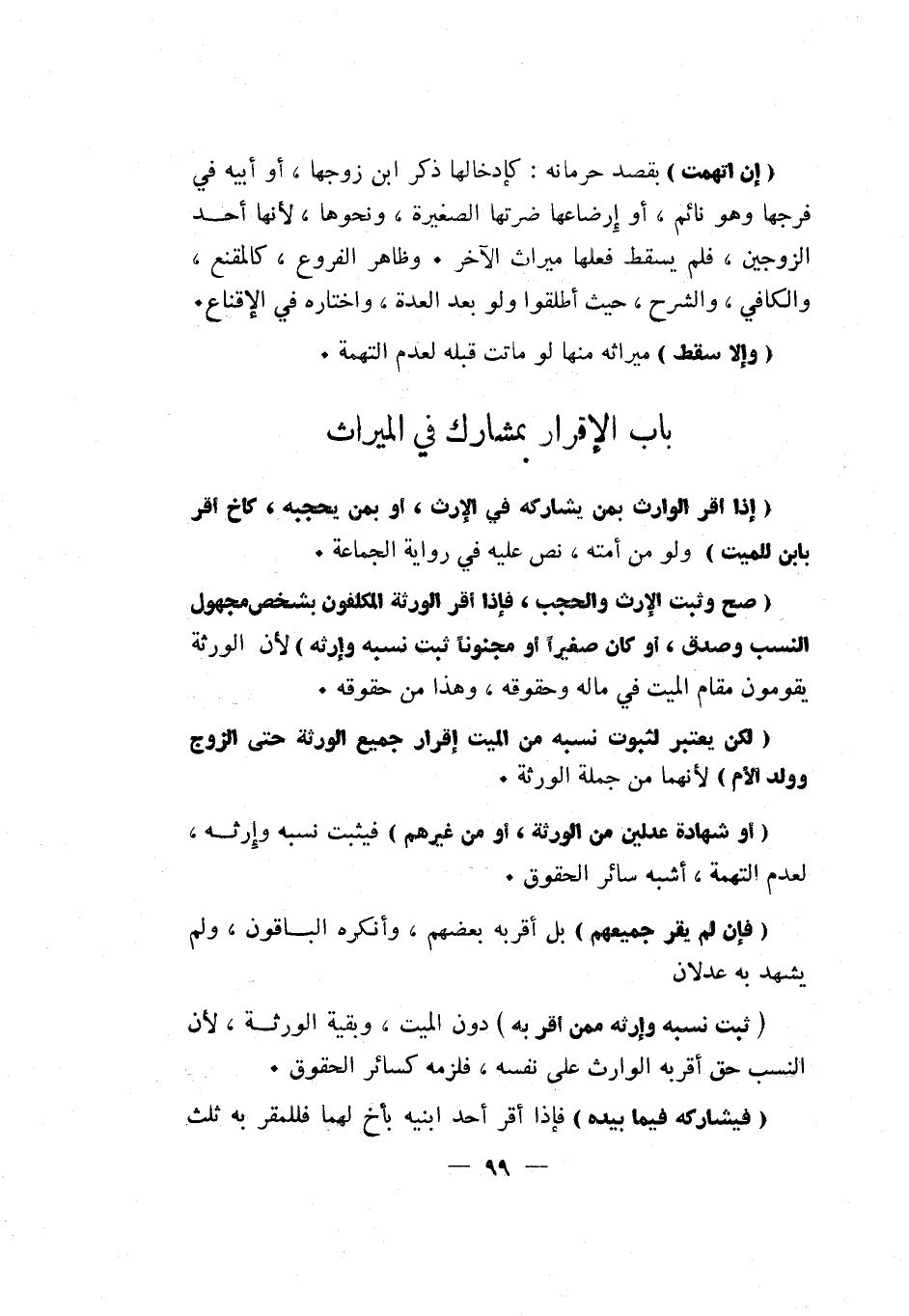 "صح وثبت الإرث والحجب، فإذا أقر الورثة المكلفون بشخص مجهول النسب وصدق، أو كان صغيراً أو مجنوناً ثبت نسبه وإرثه" لأن الورثة يقومون مقام الميت في ماله وحقوقه، وهذا من حقوقه.