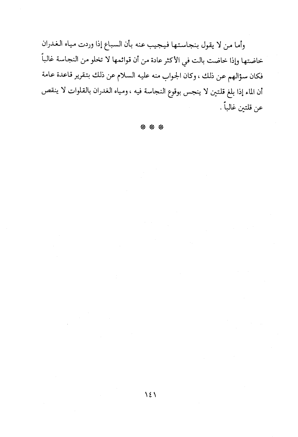 وأما من لا يقول بنجاستها فيجيب عنه بأن السباع إذا وردت مياه الغدران خاضتها وإذا خاضت بالت في الأكثر عادة من أن قوائمها لا تخلو من النجاسة غالبًا فكان سؤالهم عن ذلك، وكان الجواب منه - عليه السلام - عن ذلك بتقرير قاعدة عامة أن الماء إذا بلغ قلتين لا ينجس بوقوع النجاسة فيه، ومياه الغدران بالقلوات لا ينقص عن قلتين غالبًا.