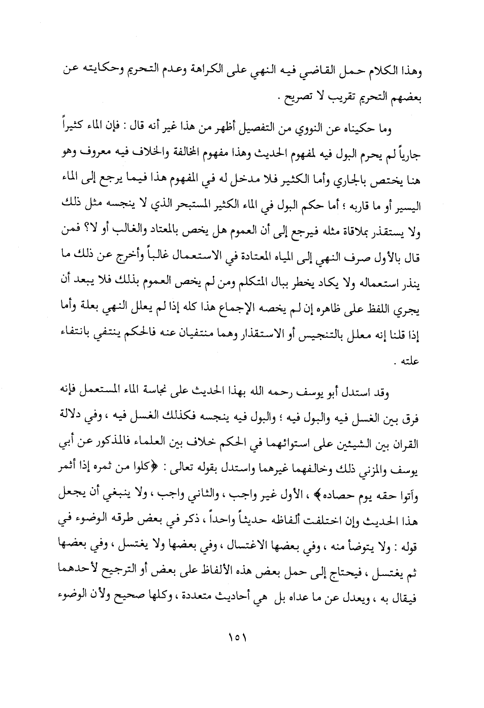 وقد استدل أبو يوسف رحمه الله بهذا الحديث على نجاسة الماء المستعمل فإنه فرق بين الغسل فيه والبول فيه؛ والبول فيه ينجسه فكذلك الغسل فيه، وفي دلالة القرآن بين الشيئين على استوائهما في الحكم خلاف بين العلماء فالمذكور عن أبي يوسف والمزني ذلك وخالفهما غيرهما واستدل بقوله تعالى: {كُلُوا مِنْ ثَمَرِهِ إِذَا أَثْمَرَ وَآتُوا حَقَّهُ يَوْمَ حَصَادِهِ}، الأول غير واجب، والثاني واجب، ولا ينبغي أن يجعل هذا الحديث وإن اختلفت ألفاظه حديثًا واحدًا، ذكر في بعض طرقه الوضوء في قوله: ولا يتوضأ منه، وفي بعضها الاغتسال، وفي بعضها ولا يغتسل، وفي بعضها ثم يغتسل، فيحتاج إلى حمل بعض هذه الألفاظ على بعض أو الترجيح لأحدهما فيقال به، ويعدل عن ما عداه بل هي أحاديث متعددة، وكلها صحيح ولأن الوضوء