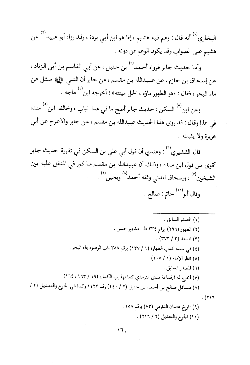 وأما حديث جابر فرواه أحمد (¬3) بن حنبل، عن أبي القاسم بن أبي الزناد، عن إسحاق بن حازم، عن عبيد الله بن مقسم، عن جابر أن النبي - صلى الله عليه وسلم - سئل عن ماء البحر، فقال: "هو الطهور ماؤه، الحل ميتته"، أخرجه ابن (¬4) ماجه.