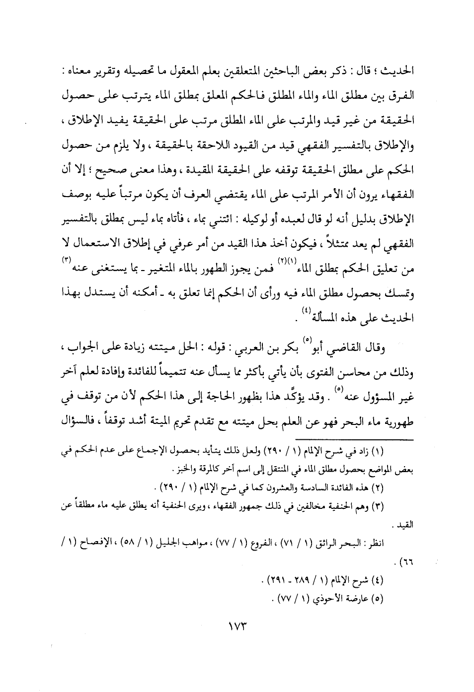 (¬1) زاد في شرح الإلمام (1/ 290) ولعل ذلك يتأيد بحصول الإجماع على عدم الحكم في بعض المواضع بحصول مطلق الماء في المنتقل إلى اسم آخر كالمرقة والخبز.