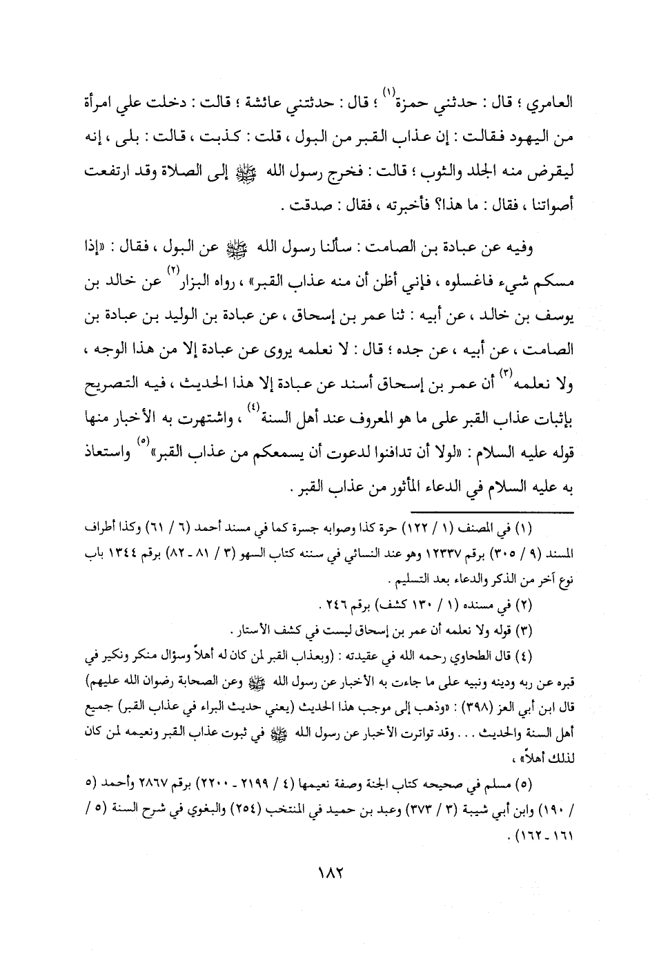 (¬4) قال الطحاوي رحمه الله في عقيدته: (وبعذاب القبر لمن كان له أهلًا وسؤال منكر ونكير في قبره عن ربه ودينه ونبيه على ما جاءت به الأخبار عن رسول الله - صلى الله عليه وسلم -، وعن الصحابة رضوان الله عليهم) قال ابن أبي العز (398): "وذهب إلى موجب هذا الحديث (يعني حديث البراء في عذاب القبر) جميع أهل السنة والحديث ... وقد تواترت الأخبار عن رسول الله - صلى الله عليه وسلم - في ثبوت عذاب القبر ونعيمه لن كان لذلك أهلًا".