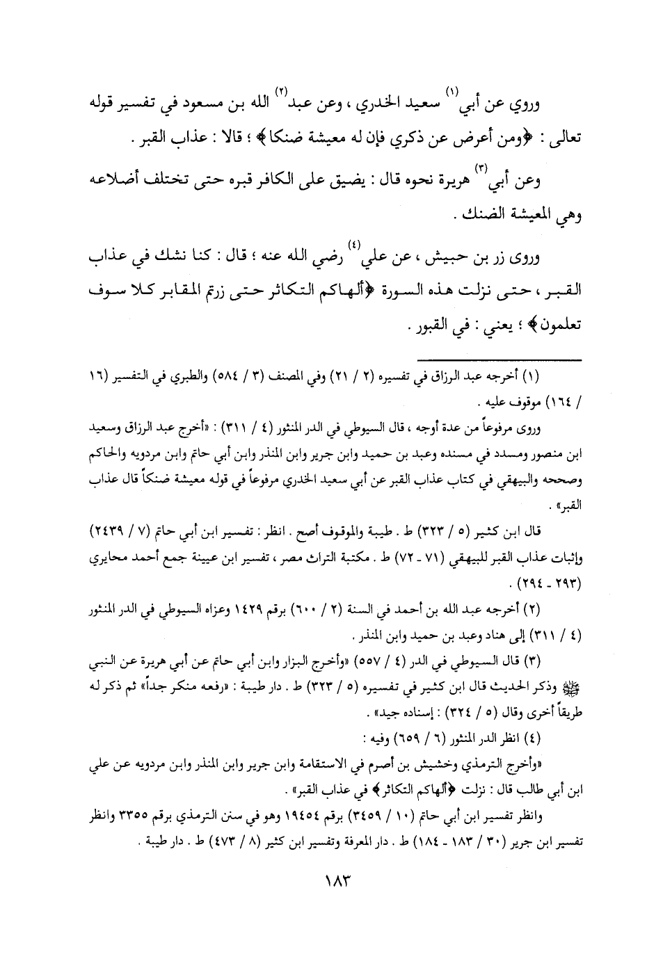 "وأخرج الترمذي وخشيش بن أصرم في الاستقامة وابن جرير وابن المنذر وابن مردويه عن علي بن أبي طالب قال: نزلت {أَلْهَاكُمُ التَّكَاثُرُ} في عذاب القبر".