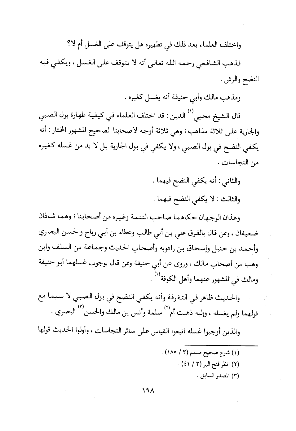 قال الشيخ محيي (¬1) الدين: قد اختلف العلماء في كيفية طهارة بول الصبي والجارية على ثلاثة مذاهب، وهي ثلاثة أوجه لأصحابنا الصحيح المشهور المختار: أنه يكفي النضح في بول الصبي، ولا يكفي في بول الجارية بل لا بد من غسله كغيره من النجاسات.
