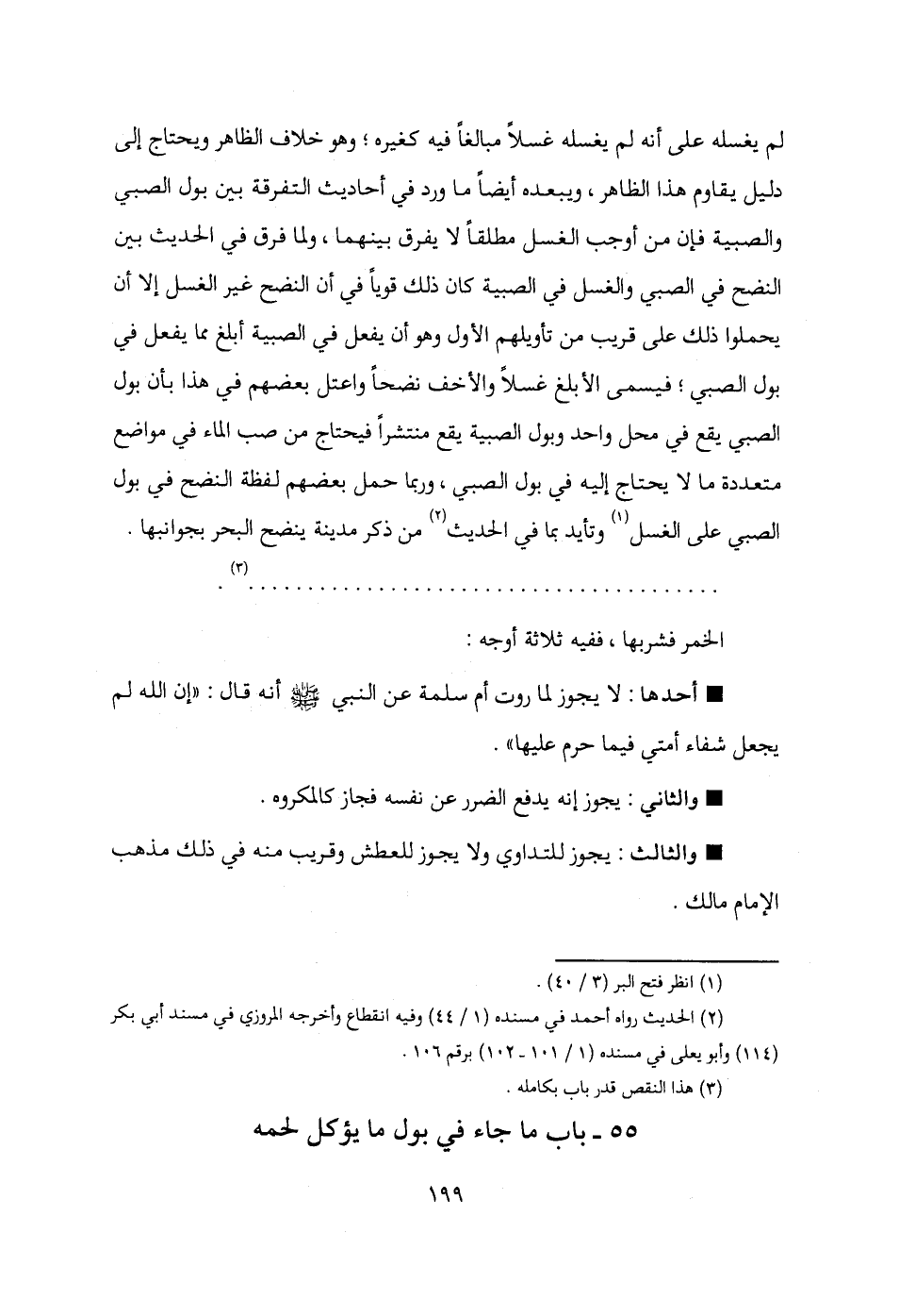 • والثالث: يجوز للتداوي ولا يجوز للعطش وقريب منه في ذلك مذهب الإِمام مالك.