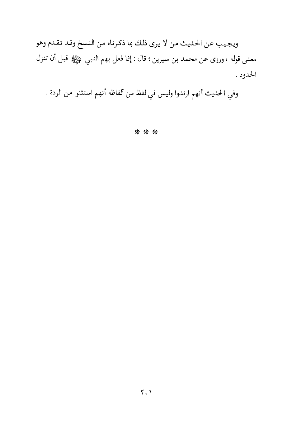 ويجيب عن الحديث من لا يرى ذلك بما ذكرناه من النسخ وقد تقدم وهو معنى قوله، وروى عن محمَّد بن سيرين؛ قال: إنما فعل بهم النبي - صلى الله عليه وسلم - قبل أن تنزل الحدود.