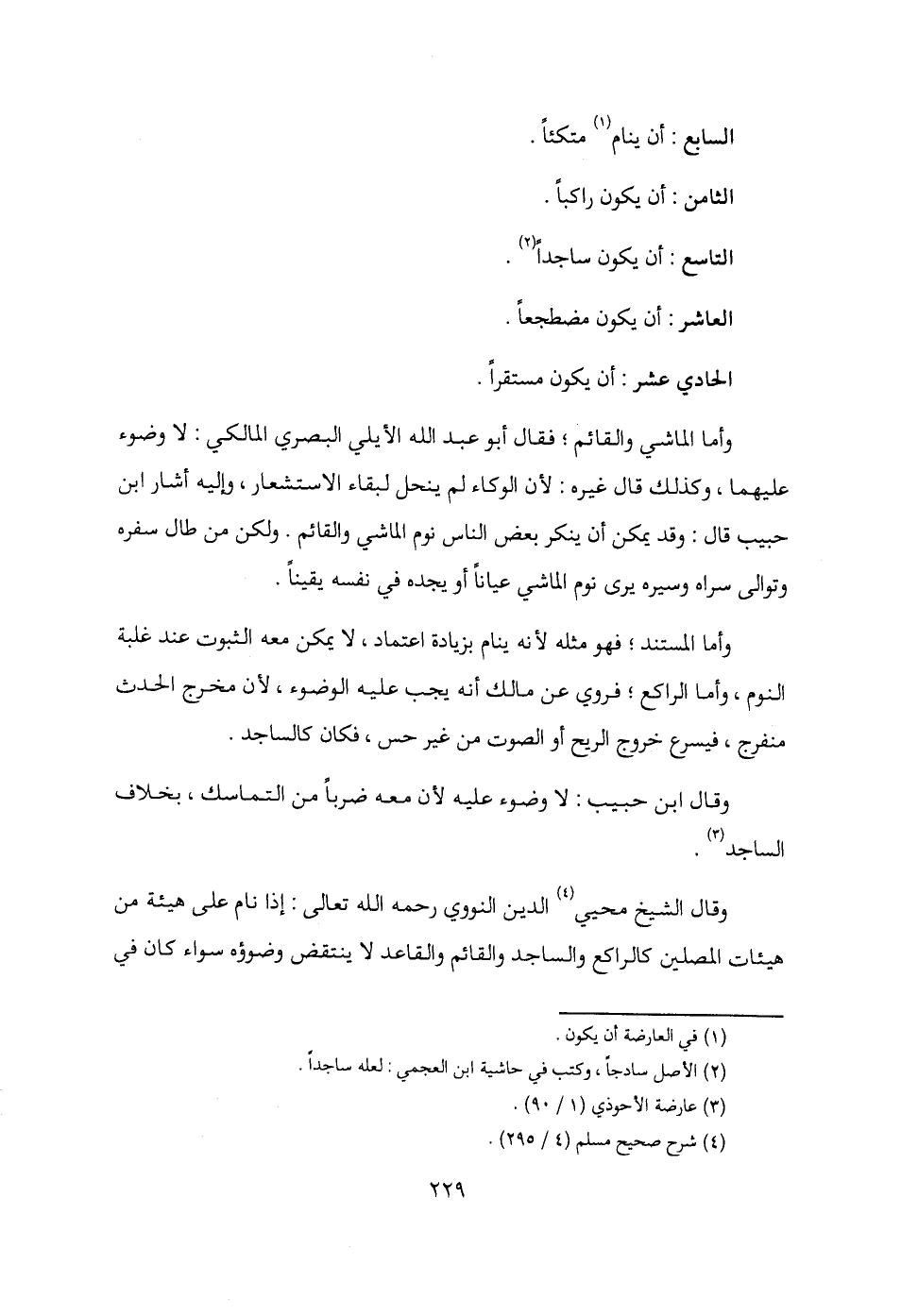 وأما الماشي والقائم؛ فقال أبو عبد الله الأيلي البصري المالكي: لا وضوء عليهما، وكذلك قال غيره: لأن الوكاء لم ينحل لبقاء الاستشعار، وإليه أشار ابن حبيب قال: وقد يمكن أن ينكر بعض الناس نوم الماشي والقائم. ولكن من طال سفره وتوالى سراه وسيره يرى نوم الماشي عيانًا أو يجده في نفسه يقينًا.