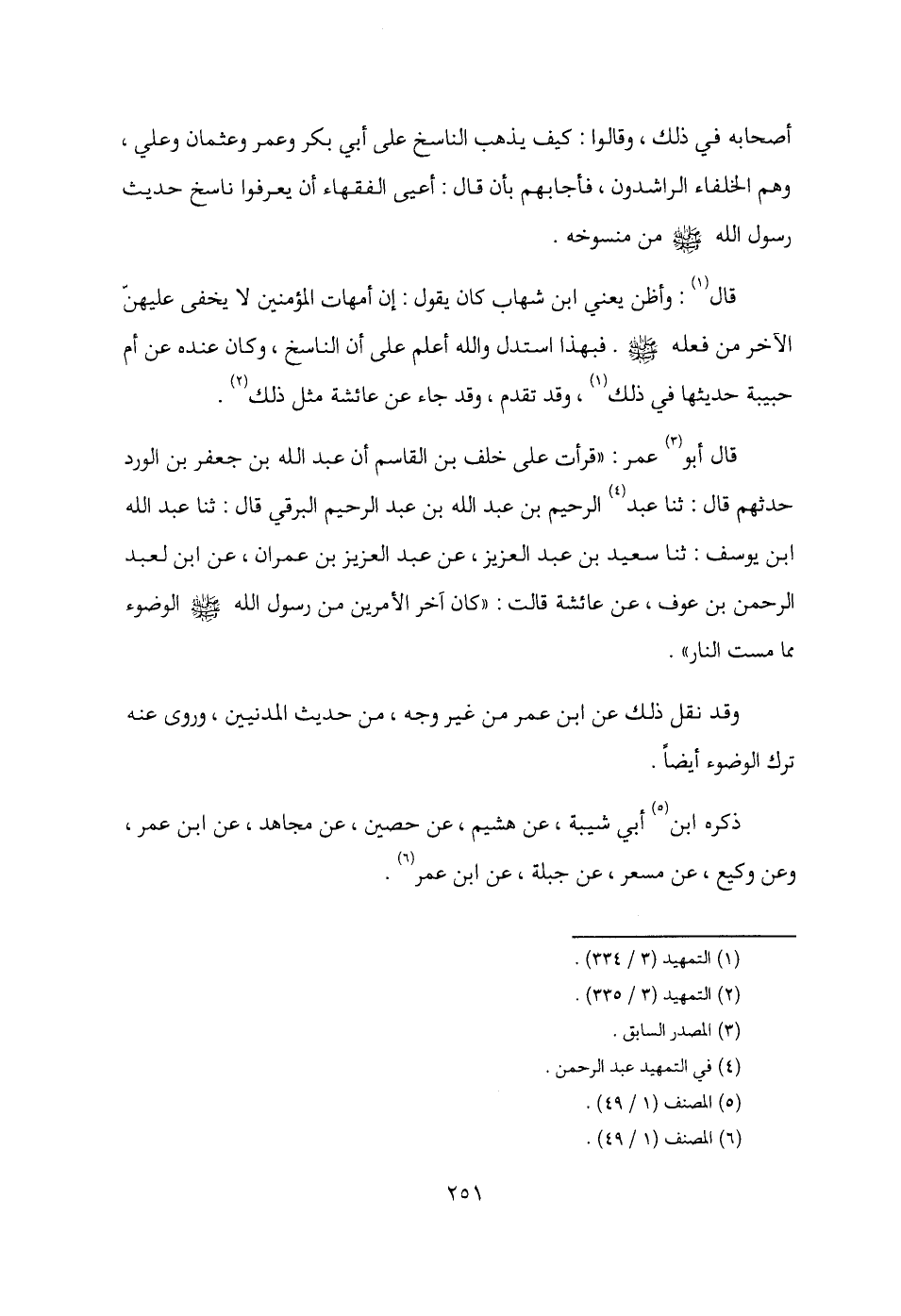 قال أبو (¬3) عمر: "قرأت على خلف بن القاسم أن عبد الله بن جعفر بن الورد حدثهم قال: ثنا عبد (¬4) الرحيم بن عبد الله بن عبد الرحيم البرقي قال: ثنا عبد الله بن يوسف: ثنا سعيد بن عبد العزيز، عن عبد العزيز بن عمران، عن ابن لعبد الرحمن بن عوف، عن عائشة قالت: "كان آخر الأمرين من رسول الله - صلى الله عليه وسلم - الوضوء مما مست النار".