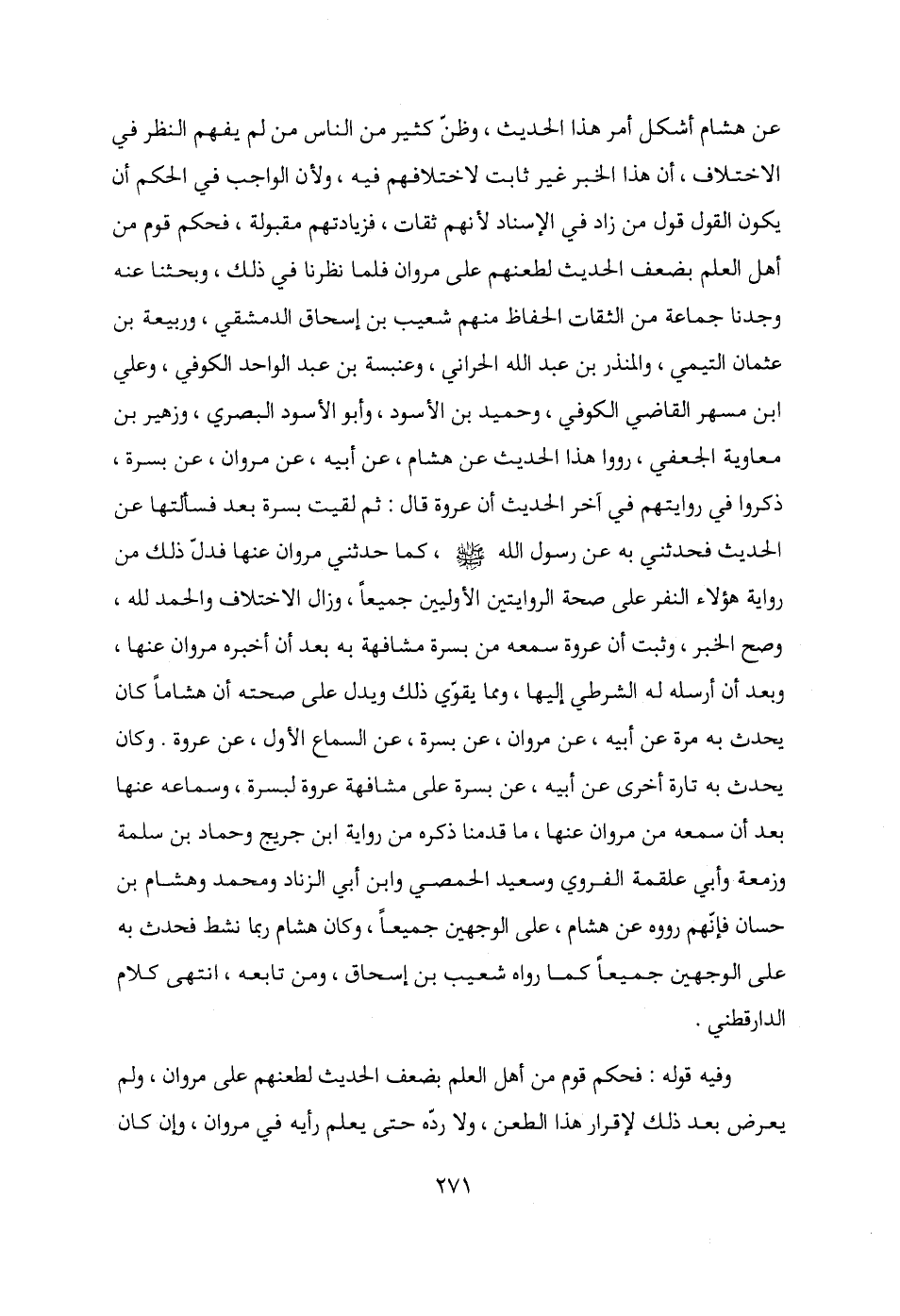 عن هشام أشكل أمر هذا الحديث، وظنّ كثير من الناس من لم يفهم النظر في الاختلاف، أن هذا الخبر غير ثابت لاختلافهم فيه، ولأن الواجب في الحكم أن يكون القول قول من زاد في الإسناد لأنهم ثقات، فزيادتهم مقبولة، فحكم قوم من أهل العلم بضعف الحديث لطعنهم على مروان فلما نظرنا في ذلك، وبحثنا عنه وجدنا جماعة من الثقات الحفاظ منهم شعيب بن إسحاق الدمشقي، وربيعة بن عثمان التيمي، والمنذر بن عبد الله الحراني، وعنبسة بن عبد الواحد الكوفي، وعلي بن مسهر القاضي الكوفي، وحميد بن الأسود، وأبو الأسود البصري، وزهير بن معاوية الجعفي، رووا هذا الحديث عن هشام، عن أبيه، عن مروان، عن بسرة، ذكروا في روايتهم في آخر الحديث أن عروة قال: ثم لقيت بسرة بعد فسألتها عن الحديث فحدثني به عن رسول الله - صلى الله عليه وسلم -، كما حدثني مروان عنها فدلّ ذلك من رواية هؤلاء النفر على صحة الروايتين الأوليين جميعًا، وزال الاختلاف والحمد لله، وصح الخبر، وثبت أن عروة سمعه من بسرة مشافهة به بعد أن أخبره مروان عنها، وبعد أن أرسله له الشرطي إليها، ومما يقوّي ذلك ويدل على صحته أن هشامًا كان يحدث به مرة عن أبيه، عن مروان، عن بسرة، عن السماع الأول، عن عروة. وكان يحدث به تارة أخرى عن أبيه، عن بسرة على مشافهة عروة لبسرة، وسماعه عنها بعد أن سمعه من مروان عنها، ما قدمنا ذكره من رواية ابن جريج وحماد بن سلمة وزمعة وأبي علقمة الفروي وسعيد الحمصي وابن أبي الزناد ومحمد وهشام بن حسان فإنهم رووه عن هشام، على الوجهين جميعًا، وكان هشام ربما نشط فحدث به على الوجهين جميعًا كما رواه شعيب بن إسحاق، ومن تابعه، انتهى كلام الدارقطني.