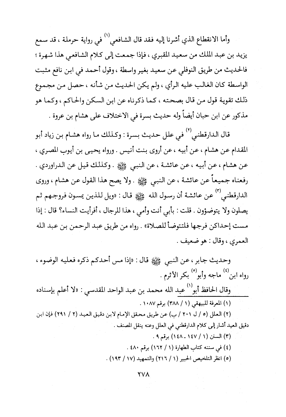 (¬2) العلل (5 / ل 201 / ب) عن طريق محقق الإمام لابن دقيق العيد (2/ 291) فإن ابن دقيق العيد أشار إلى كلام الدارقطني في العلل وعنه ينقل المصنف.