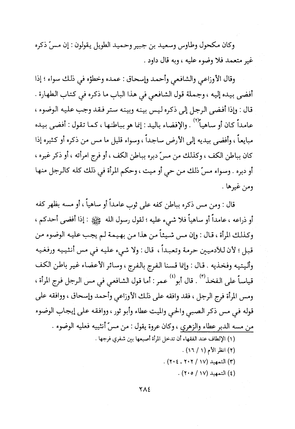 وقال الأوزاعي والشافعي وأحمد وإسحاق: عمده وخطؤه في ذلك سواء؛ إذا أفضى بيده إليه، وجملة قول الشافعي في هذا الباب ما ذكره في كتاب الطهارة. قال: وإذا أفضى الرجل إلى ذكره ليس بينه وبينه ستر فقد وجب عليه الوضوء، عامدًا كان أو ساهيًا (¬2). والإفضاء باليد: إنما هو بباطنها، كما تقول: أفضى بيده مبايعًا، وأفضى بيديه إلى الأرض ساجدًا، وسواء قليل ما مس من ذكره أو كثيره إذا كان بباطن الكف، وكذلك من مسّ دبره بباطن الكف، أو فرج امرأته، أو ذكر غيره، أو دبره. وسواء مسّ ذلك من حي أو ميت، وحكم المرأة في ذلك كله كالرجل منها ومن غيرها.