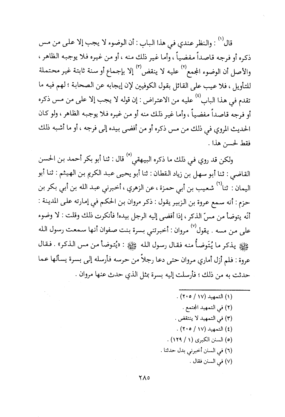 ولكن قد روي في ذلك ما ذكره البيهقي (¬5) قال: ثنا أبو بكر أحمد بن الحسن القاضي: ثنا أبو سهل بن زياد القطان: ثنا أبو يحيى عبد الكريم بن الهيثم: ثنا أبو اليمان: ثنا (¬6) شعيب بن أبي حمزة، عن الزهريّ، أخبرني عبد الله بن أبي بكر بن حزم: أنه سمع عروة بن الزبير يقول: ذكر مروان بن الحكم في إمارته على المدينة: أنَّه يتوضأ من مس الذكر، إذا أفضى إليه الرجل بيده! فأنكرت ذلك وقلت: لا وضوء على من مسه. يقول (¬7) مروان: أخبرتني بسرة بنت صفوان أنها سمعت رسول الله - صلى الله عليه وسلم - يذكر ما يُتَوضأُ منه فقال رسول الله - صلى الله عليه وسلم -: "يُتوضأ من مس الذكر". فقال عروة: فلم أزل أماري مروان حتى دعا رجلًا من حرسه فأرسله إلى بسرة يسألها عما حدثت به من ذلك؛ فأرسلت إليه بسرة بمثل الذي حدث عنها مروان.