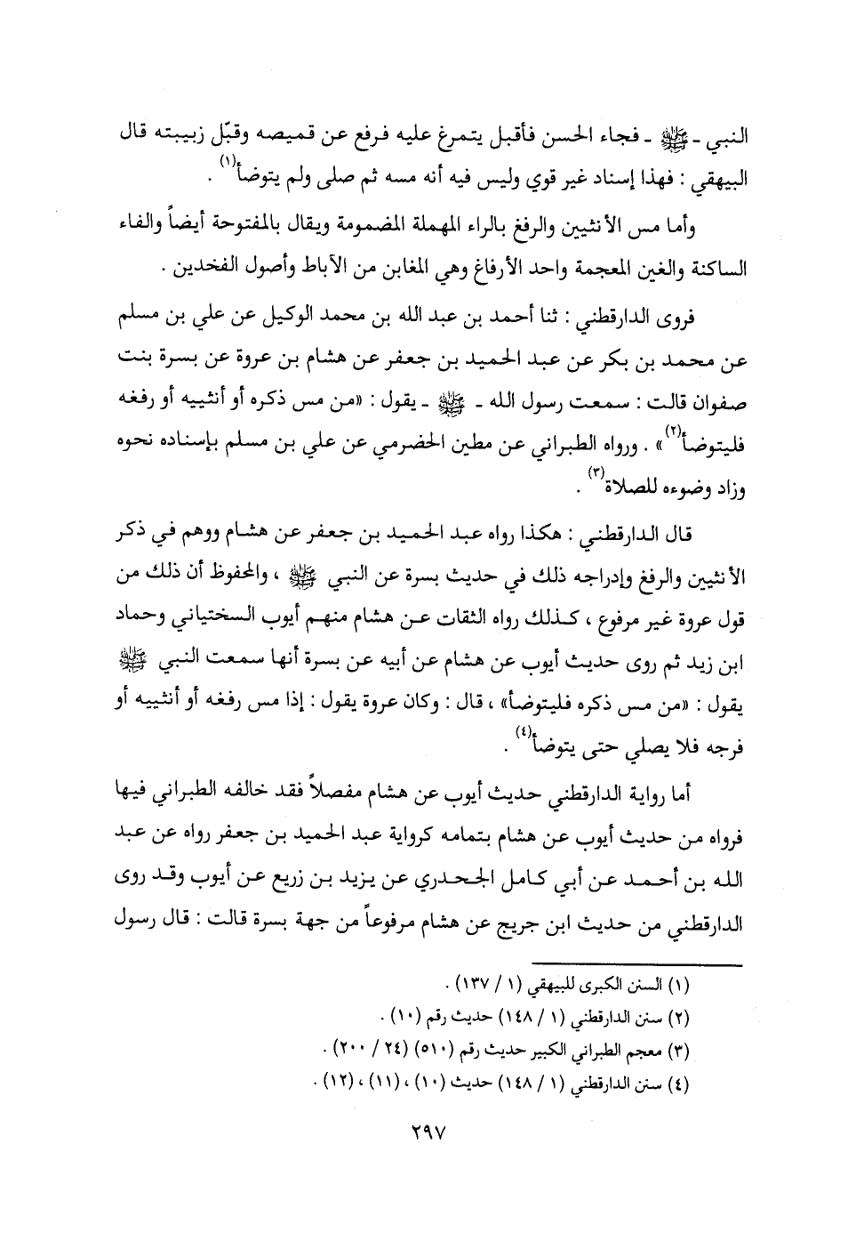 قال الدارقطني: هكذا رواه عبد الحميد بن جعفر عن هشام ووهم في ذكر الأنثيين والرفغ وإدراجه ذلك في حديث بسرة عن النبي - صلى الله عليه وسلم -، والمحفوظ أن ذلك من قول عروة غير مرفوع، كذلك رواه الثقات عن هشام منهم أيوب السختياني وحماد بن زيد ثم روى حديث أيوب عن هشام عن أبيه عن بسرة أنها سمعت النبي - صلى الله عليه وسلم - يقول: "من مس ذكره فليتوضأ"، قال: وكان عروة يقول: إذا مس رفغه أو أنثييه أو فرجه فلا يصلي حتى يتوضأ (¬4).