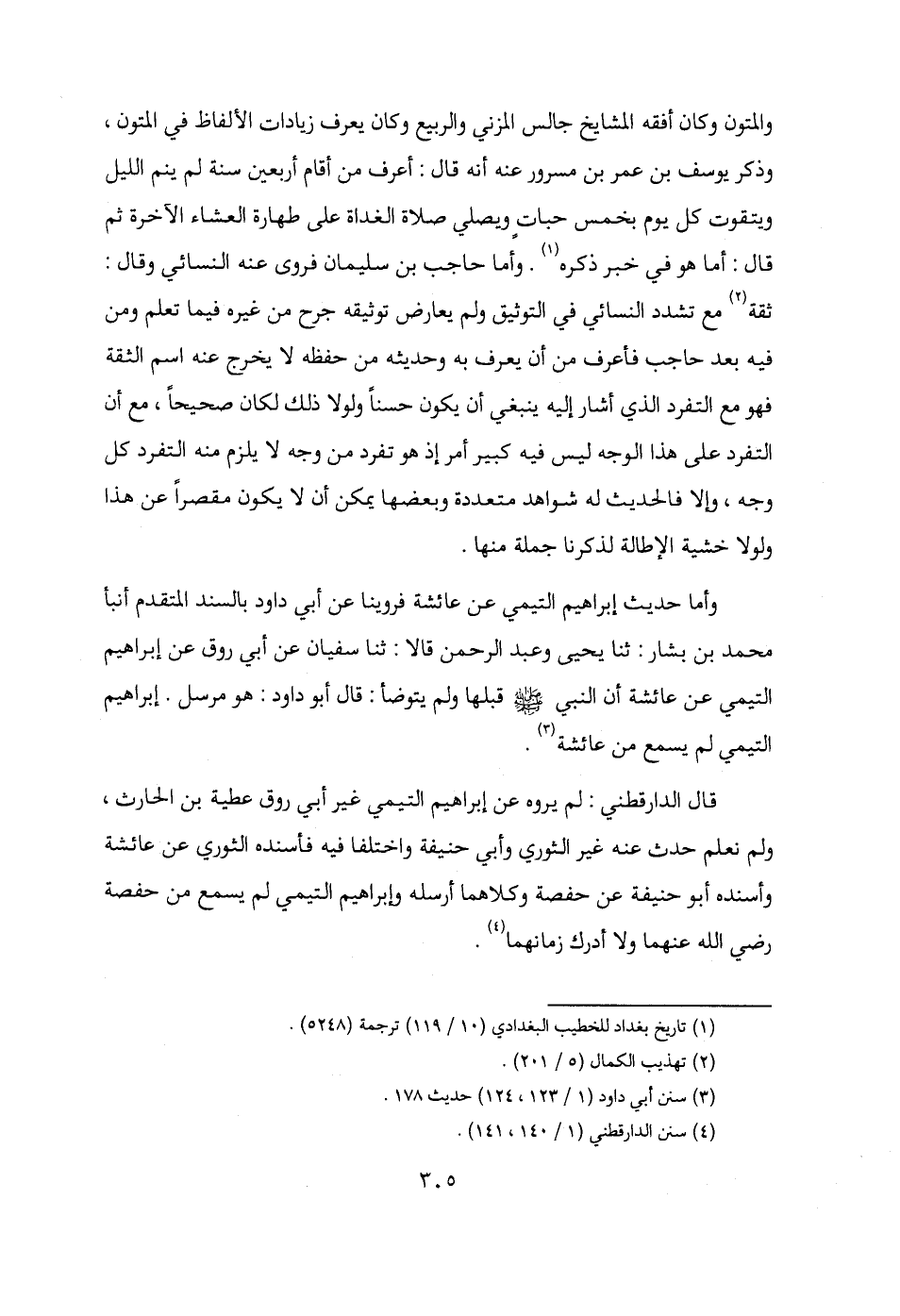 وأما حديث إبراهيم التيمي عن عائشة فروينا عن أبي داود بالسند المتقدم أنبأ محمد بن بشار: ثنا يحيى وعبد الرحمن قالا: ثنا سفيان عن أبي روق عن إبراهيم التيمي عن عائشة أن النبي - صلى الله عليه وسلم - قبلها ولم يتوضأ: قال أبو داود: هو مرسل. إبراهيم التيمي لم يسمع من عائشة (¬3).