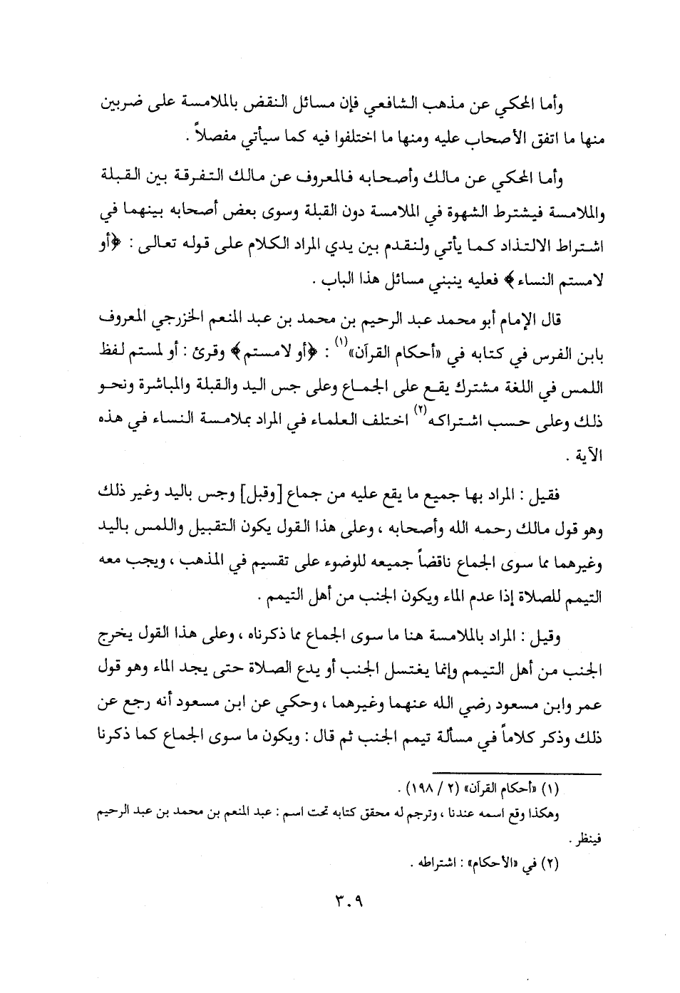 قال الإمام أبو محمد عبد الرحيم بن محمد بن عبد المنعم الخزرجي المعروف بابن الفرس في كتابه في "أحكام القرآن" (¬1): {أو لامستم} وقرئ: أو لمستم لفظ اللمس في اللغة مشترك يقع على الجماع وعلى جس اليد والقبلة والمباشرة ونحو ذلك وعلى حسب اشتراكه (¬2) اختلف العلماء في المراد بملامسة النساء في هذه الآية.