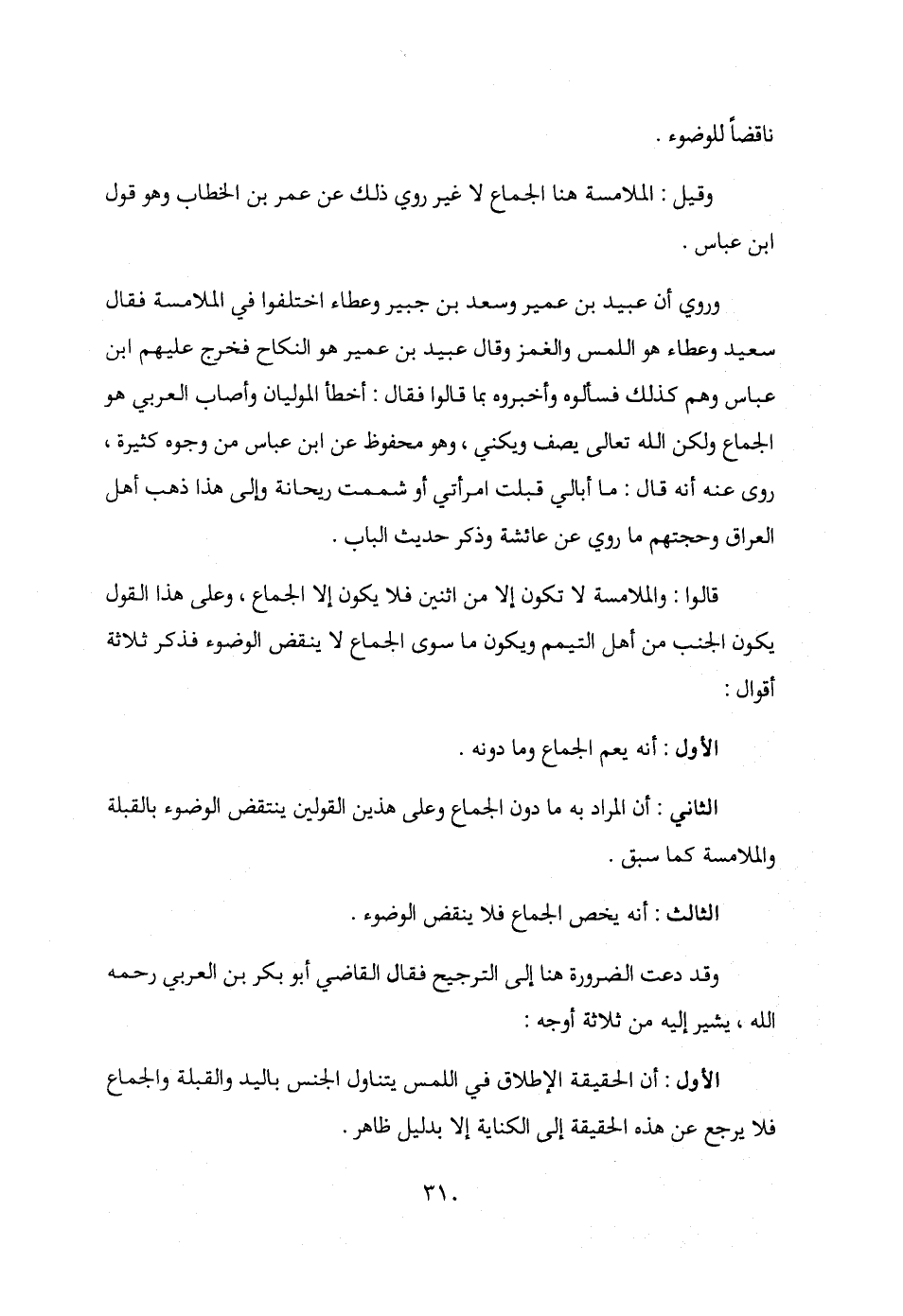 قالوا: والملامسة لا تكون إلا من اثنين فلا يكون إلا الجماع، وعلى هذا القول يكون الجنب من أهل التيمم ويكون ما سوى الجماع لا ينقض الوضوء فذكر ثلاثة أقوال:
