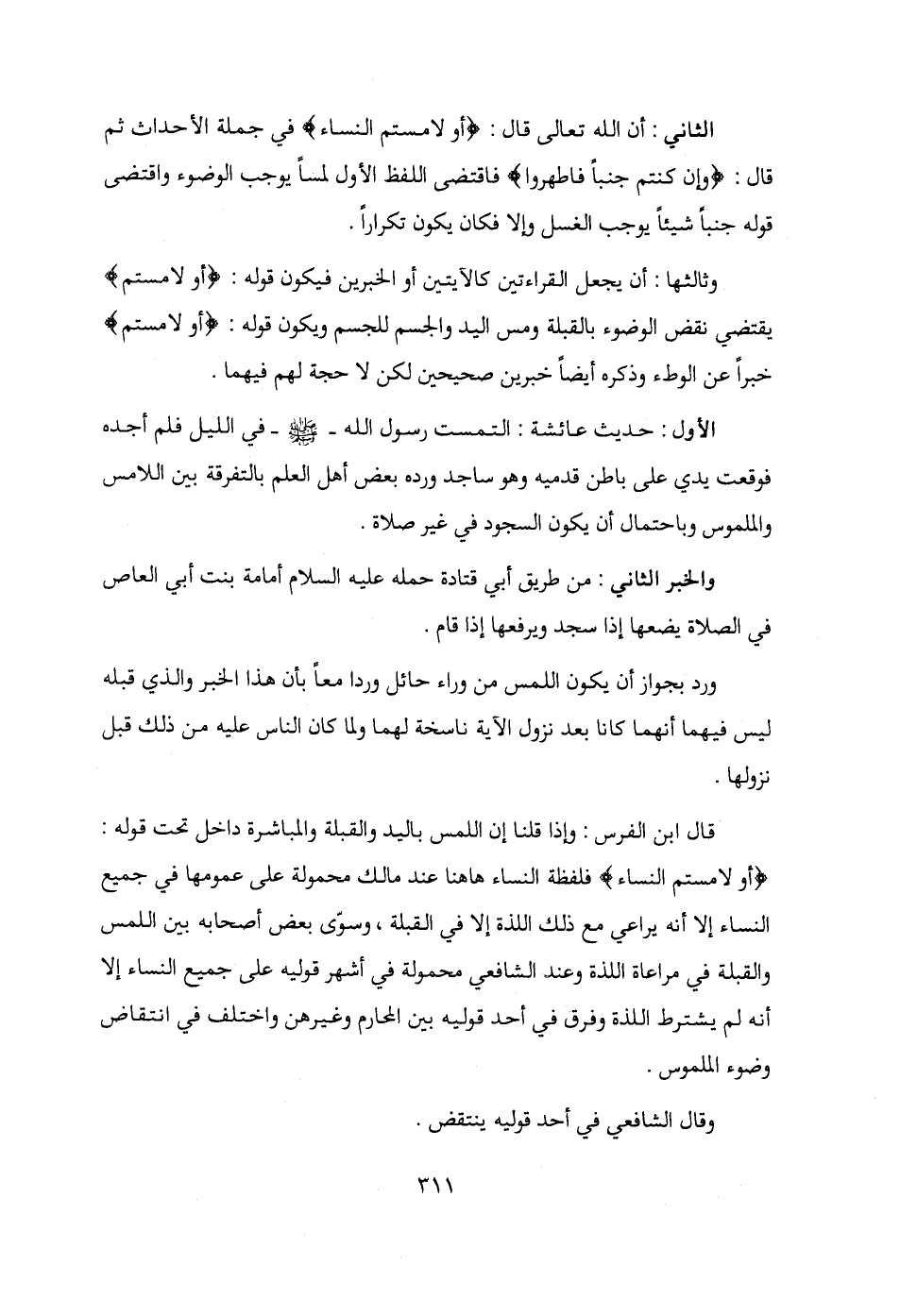 قال ابن الفرس: وإذا قلنا إن اللمس باليد والقبلة والمباشرة داخل تحت قوله: {أو لامستم النساء} فلفظة النساء هاهنا عند مالك محمولة على عمومها في جميع النساء إلا أنه يراعي مع ذلك اللذة إلا في القبلة، وسؤى بعض أصحابه بين اللمس والقبلة في مراعاة اللذة وعند الشافعي محمولة في أشهر قوليه على جميع النساء إلا أنه لم يشترط اللذة وفرق في أحد قوليه بين المحارم وغيرهن واختلف في انتقاض وضوء الملموس.