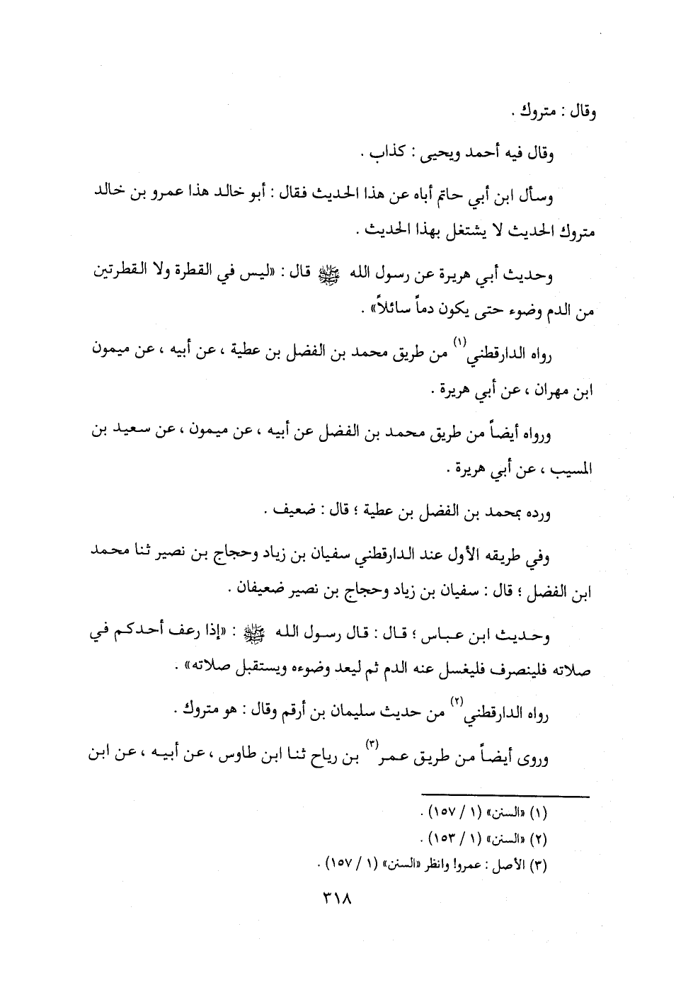وحديث أبي هريرة عن رسول الله - صلى الله عليه وسلم - قال: "ليس في القطرة ولا القطرتين من الدم وضوء حتى يكون دمًا سائلًا".