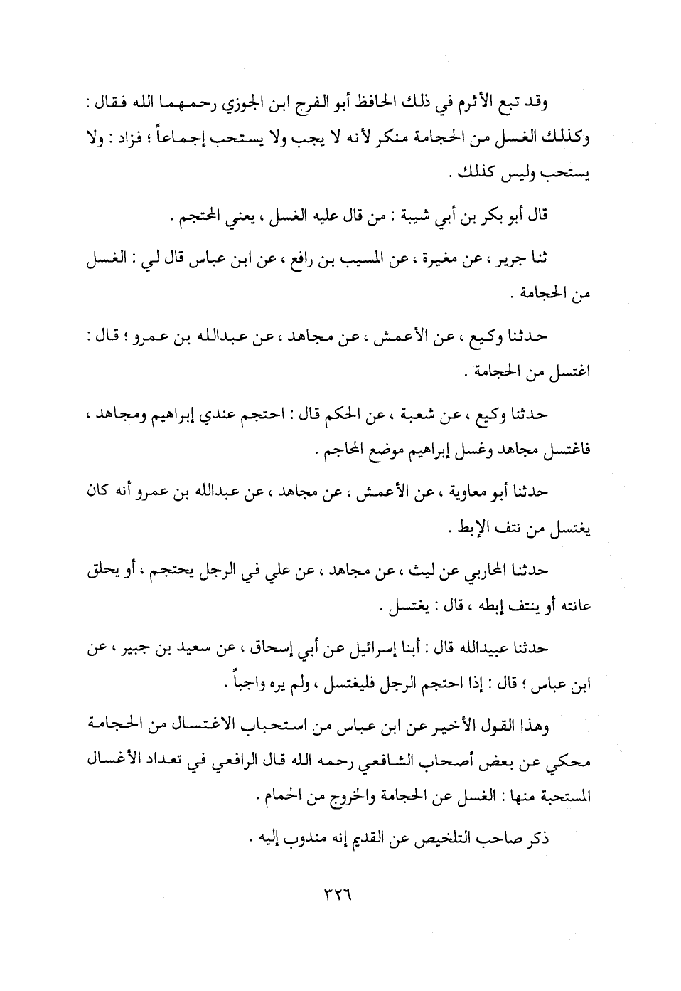 ثنا جرير، عن مغيرة، عن المسيب بن رافع، عن ابن عباس قال لي: الغسل من الحجامة.