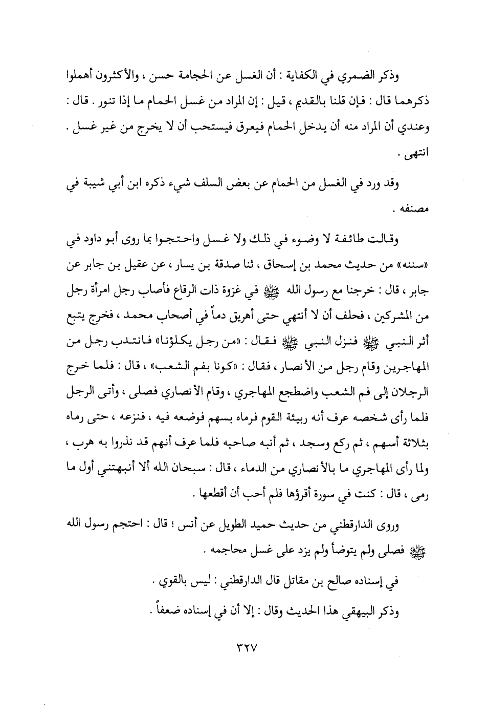 وقالت طائفة لا وضوء في ذلك ولا غسل واحتجوا بما روى أبو داود في "سننه" من حديث محمد بن إسحاق، ثنا صدقة بن يسار، عن عقيل بن جابر عن جابر، قال: خرجنا مع رسول الله - صلى الله عليه وسلم - في غزوة ذات الرقاع فأصاب رجل امرأة رجل من المشركين، فحلف أن لا أنتهي حتى أهريق دمًا في أصحاب محمد، فخرج يتبع أثر النبي - صلى الله عليه وسلم - فنزل النبي - صلى الله عليه وسلم - فقال: "من رجل يكلؤنا" فانتدب رجل من المهاجرين وقام رجل من الأنصار، فقال: "كونا بفم الشعب"، قال: فلما خرج الرجلان إلى فم الشعب واضطجع المهاجري، وقام الأنصاري فصلى، وأتى الرجل فلما رأى شخصه عرف أنه ربيئة القوم فرماه بسهم فوضعه فيه، فنزعه، حتى رماه بثلاثة أسهم، ثم ركع وسجد، ثم أنبه صاحبه فلما عرف أنهم قد نذروا به هرب، ولما رأى المهاجري ما بالأنصاري من الدماء، قال: سبحان الله ألا أنبهتني أول ما رمى، قال: كنت في سورة أقرؤها فلم أحب أن أقطعها.