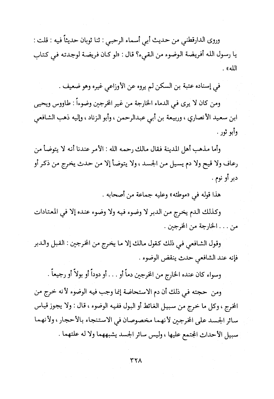 ومن حجته في ذلك أن دم الاستحاضة إنما وجب فيه الوضوء لأنه خرج من المخرج، وكل ما خرج من سبيل الغائط أو البول ففيه الوضوء، قال: ولا يجوز قياس سائر الجسد على المخرجين لأنهما مخصوصان في الاستنجاء بالأحجار، ولأنهما سبيل الأحداث المجتمع عليها، وليس سائر الجسد يشبههما ولا له علتهما.