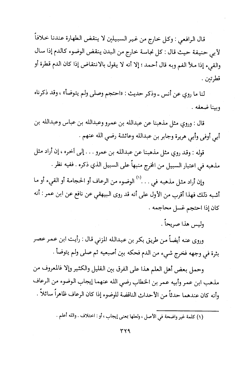 وحمل بعض أهل العلم هذا على الفرق بين القليل والكثير وإلا فالمعروف من مذهب ابن عمر وأبيه عمر بن الخطاب رضي الله عنهما إيجاب الوضوء من الرعاف وأنه كان عندهما حدثًا من الأحداث الناقضة للوضوء إذا كان الرعاف ظاهرًا سائلًا.