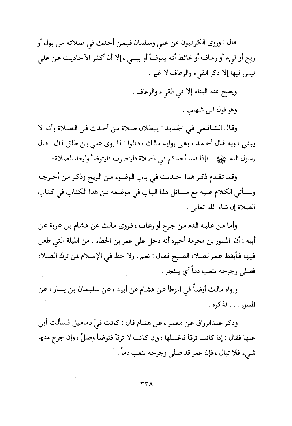 قال: وروى الكوفيون عن علي وسلمان فيمن أحدث في صلاته من بول أو ريح أو قيء أو رعاف أو غائط أنه يتوضأ أو يبني، إلا أن أكثر الأحاديث عن علي ليس فيها إلا ذكر القيء والرعاف لا غير.