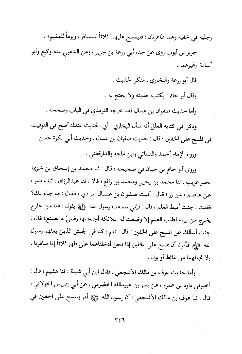 وروى أبو حاتم بن حبان في صحيحه، قال: ثنا محمد بن إسحاق بن خزيمة بخبر غريب، ثنا محمد بن يحيى ومحمد بن رافع؛ قالا: ثنا عبد الرزاق، ثنا معمر، عن عاصم، عن زر؛ قال: أتيت صفوان بن عسال المرادي، فقال: ما جاء بك؛ فقلت: جئت أنبط العلم، قال: فإني سمعت رسول الله - صلى الله عليه وسلم - يقول: "ما من خارج يخرج من بيته لطلب العلم إلا وضعت له الملائكة أجنحتها رضىً بما يصنع" قال: جئت أسألك عن المسح على الخفين؛ قال: نعم، كنا في الجيش الذين بعثهم رسول الله - صلى الله عليه وسلم - فأمرنا أن نمسح على الخفين إذا نحن أدخلناهما على طهر ثلاثًا إذا سافرنا، ولا نجعلهما من غائط أو بول.