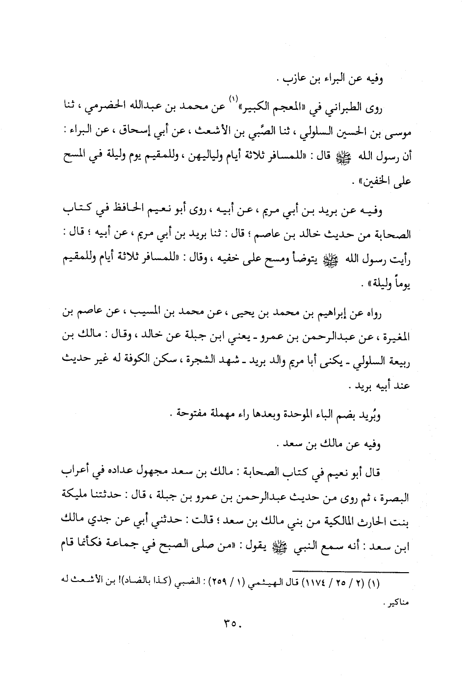 روى الطبراني في "المعجم الكبير" (¬1) عن محمد بن عبد الله الحضرمي، ثنا موسى بن الحسين السلولي، ثنا الصَّبي بن الأشعث، عن أبي إسحاق، عن البراء: أن رسول الله - صلى الله عليه وسلم - قال: "للمسافر ثلاثة أيام ولياليهن، وللمقيم يوم وليلة في المسح على الخفين".