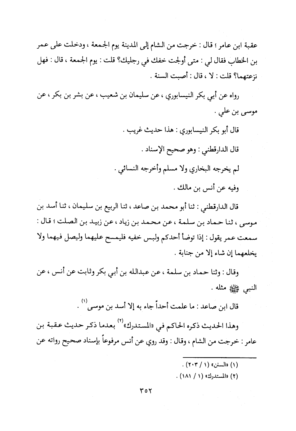 عقبة بن عامر، قال: خرجت من الشام إلى المدينة يوم الجمعة، ودخلت على عمر بن الخطاب فقال لي: متى أولجت خفك في رجليك؟ قلت: يوم الجمعة، قال: فهل نزعتهما؟ قلت: لا، قال: أصبت السنة.